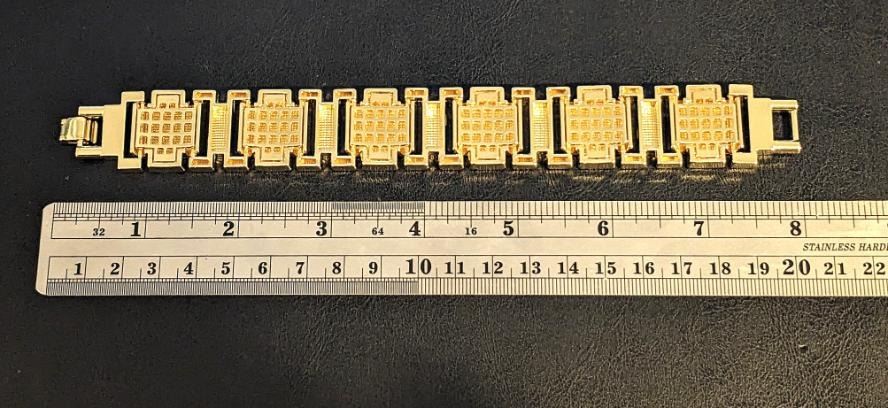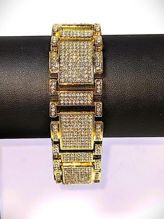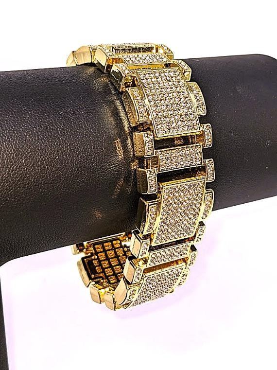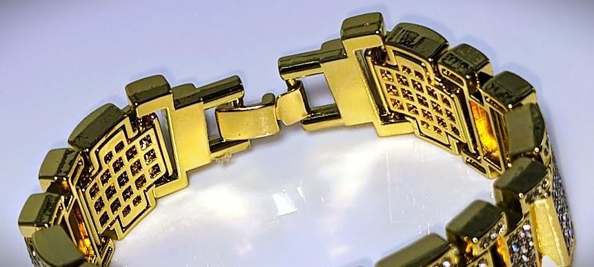 Huge 90 Gram 14 Kt Gold Plate Italian God Father Simulated Diamond Link Bracelet. This Sparkling Bracelet Measures 8 Inches Long and a Stealth 22 mm Wide.