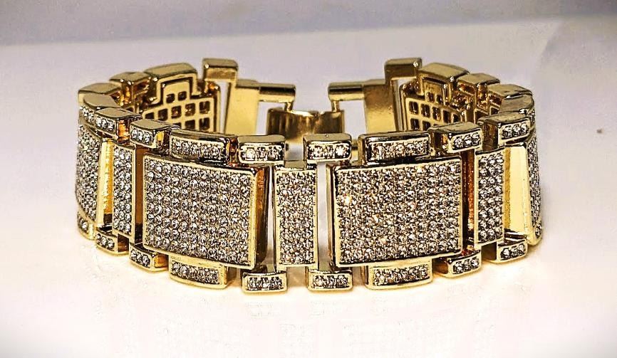 Huge 90 Gram 14 Kt Gold Plate Italian God Father Simulated Diamond Link Bracelet. This Sparkling Bracelet Measures 8 Inches Long and a Stealth 22 mm Wide.