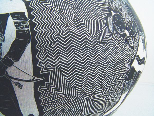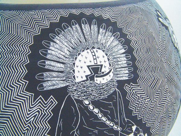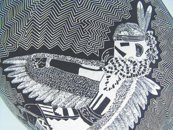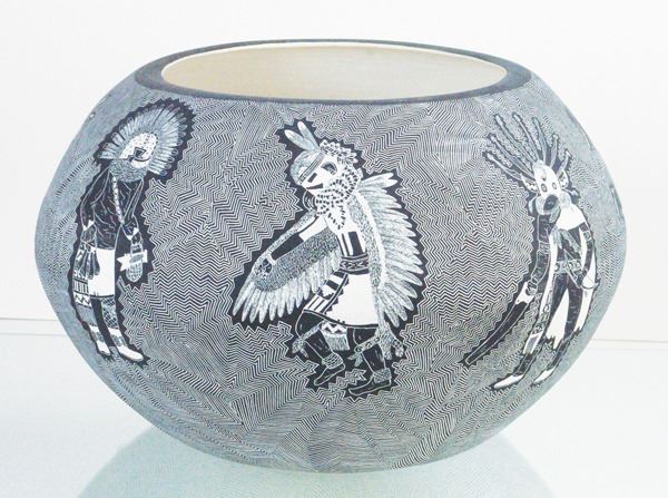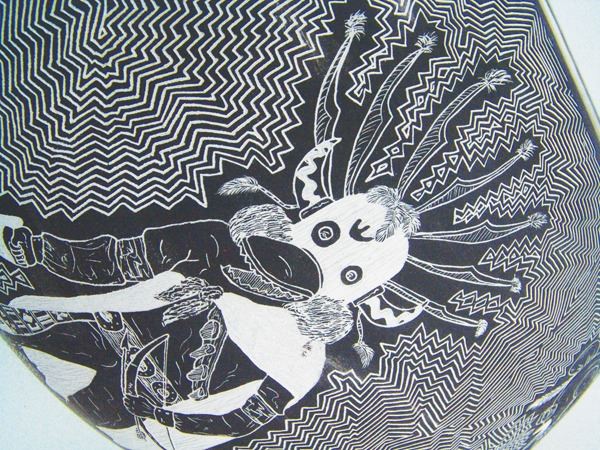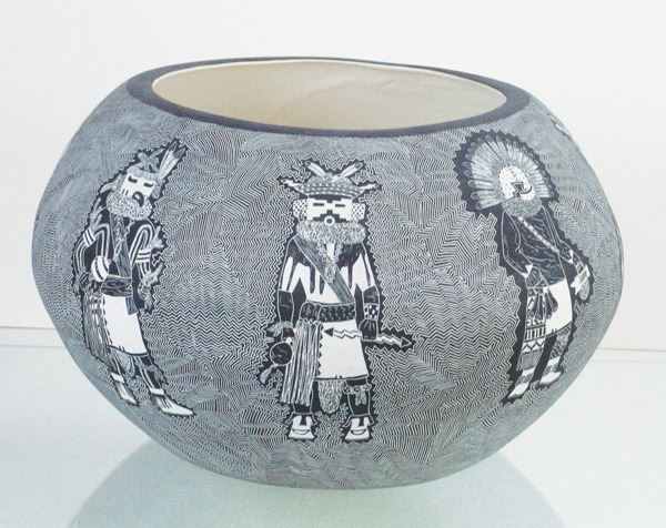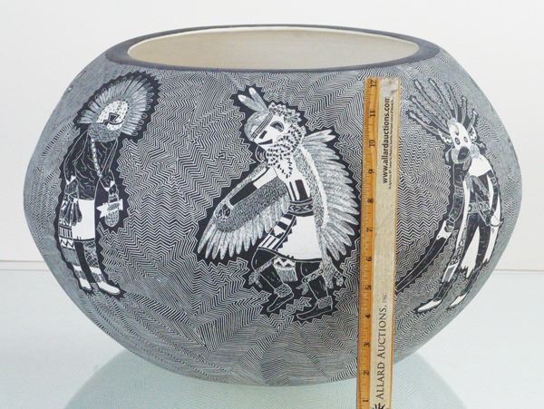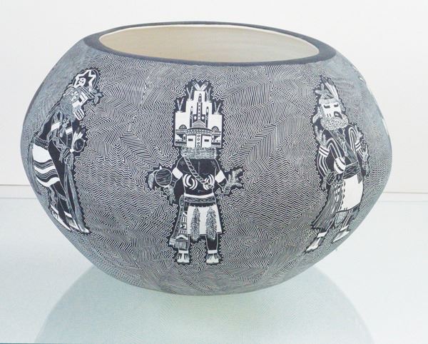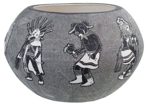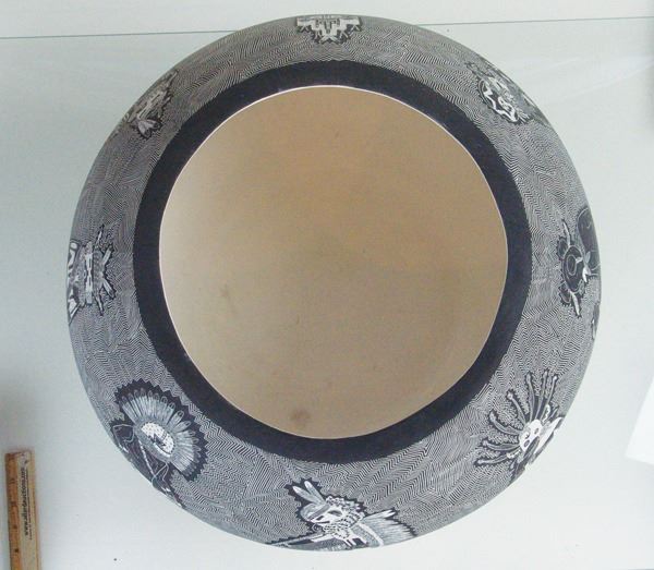 Amazing, very large, fully incised green ware jar loaded with kachina figures on an exquisitely carved background.Late 1900s12" x 20"