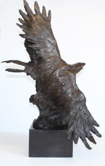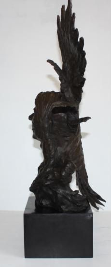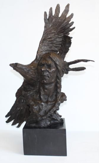 Native American Indian & Eagle Bronze Sculpture Bust, After Lobo, 20"H x 27"w x 9"D 40 lbs. This bronze sculpture was produced using the "Lost Wax" casting method. The"Lost Wax" Cast method is the most precise metal casting technique in existence, ensuring exquisite detail of the original host model which is usually sculpted in clay or wax. This "Lost Wax" casting method is an extremely labor intensive and expensive process, but the end results produce a Heirloom Quality Masterpiece!