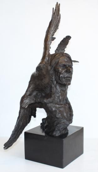 Native American Indian & Eagle Bronze Sculpture Bust, After Lobo, 20"H x 27"w x 9"D 40 lbs. This bronze sculpture was produced using the "Lost Wax" casting method. The"Lost Wax" Cast method is the most precise metal casting technique in existence, ensuring exquisite detail of the original host model which is usually sculpted in clay or wax. This "Lost Wax" casting method is an extremely labor intensive and expensive process, but the end results produce a Heirloom Quality Masterpiece!
