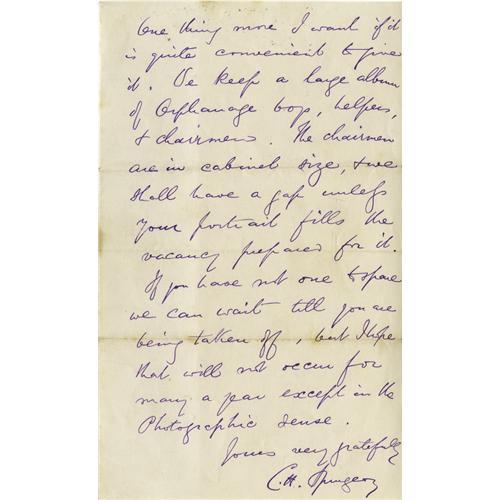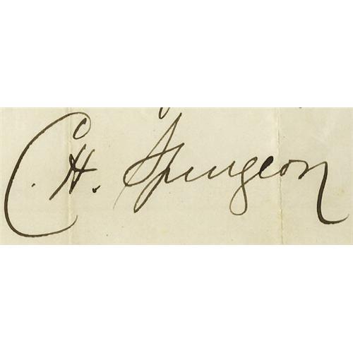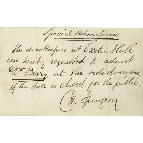 <B>Huge C.H. Spurgeon Autograph Note Signed</B></I> "<I>C. H. Spurgeon</B></I>". One page, 7"x 5", np, nd. In full: "<I>Special Admission The doorkeepers at Exeter Hall are hereby requested to admit Dr. Berry at the side door, even if the door is closed for the public.</B></I>" This pass is bold and well accomplished, Exeter Hall was home to Spurgeon's first "large congregation" where he attracted crowds of nearly 10,000 to hear his sermons. Very fine.