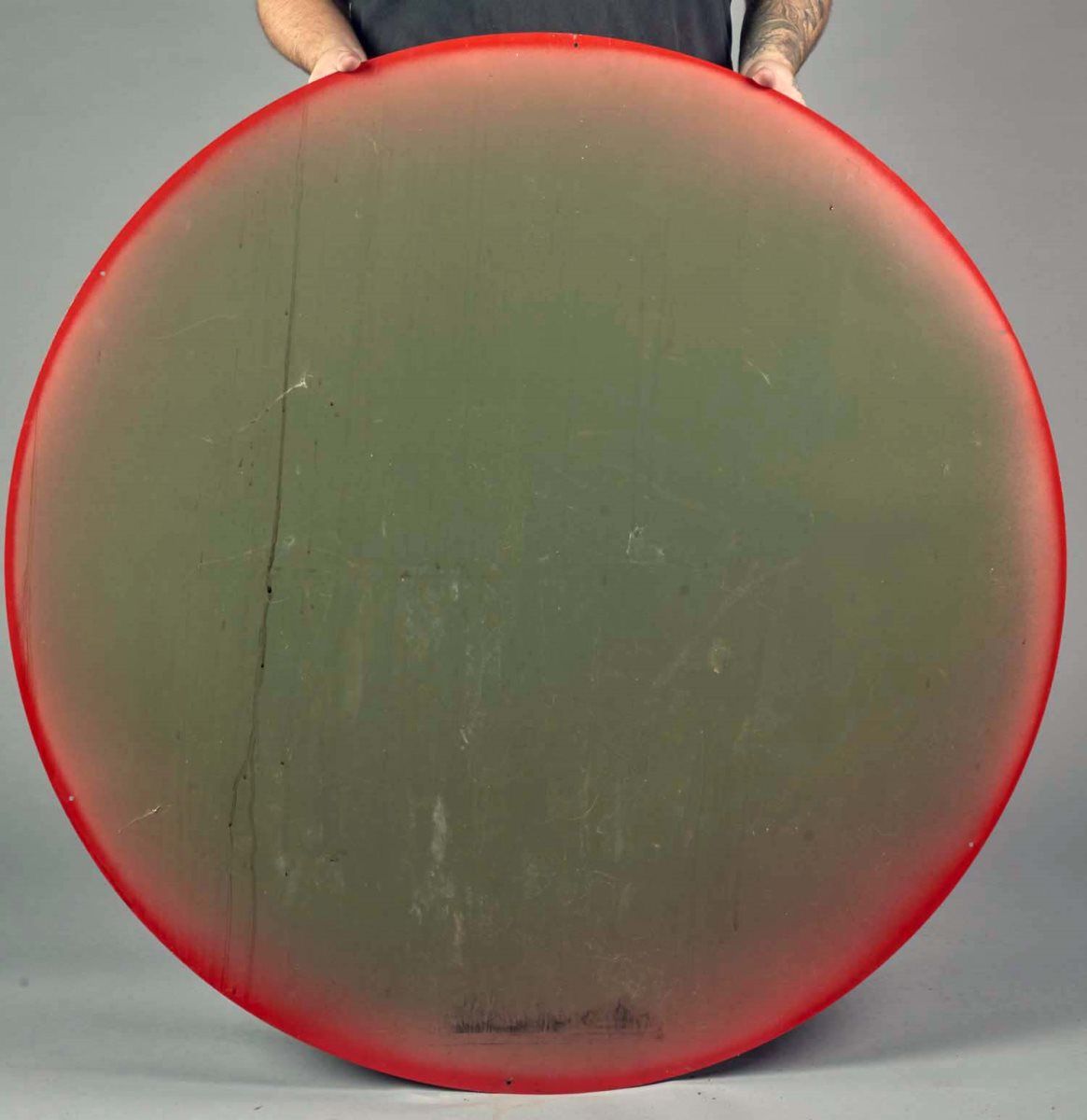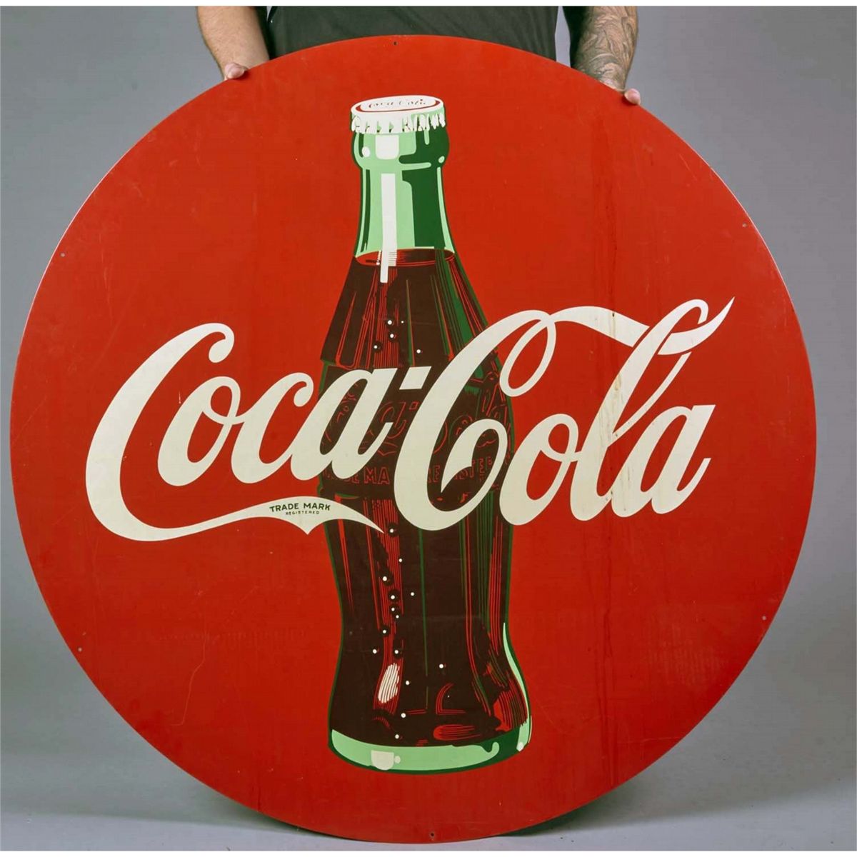 Round sign shows an image of a Coke bottle, circa 1934. Appears to be NOS. Condition (Near mint). Size 45 1/2" across