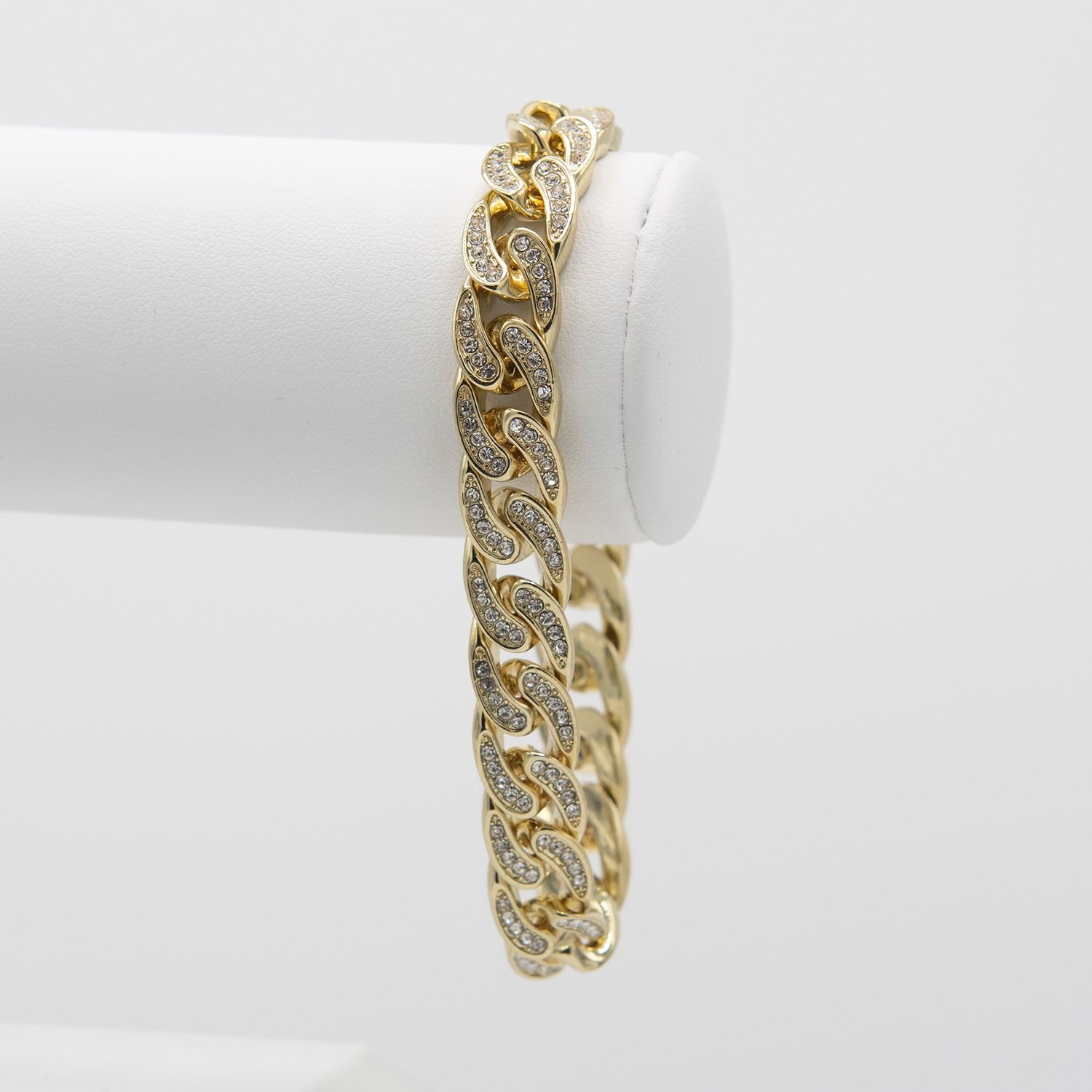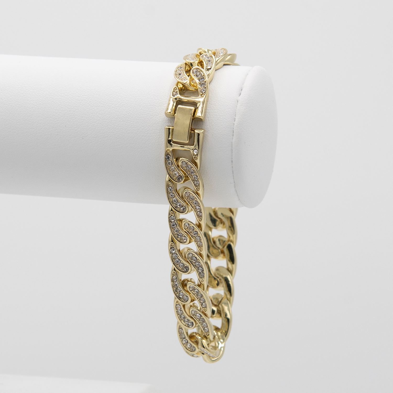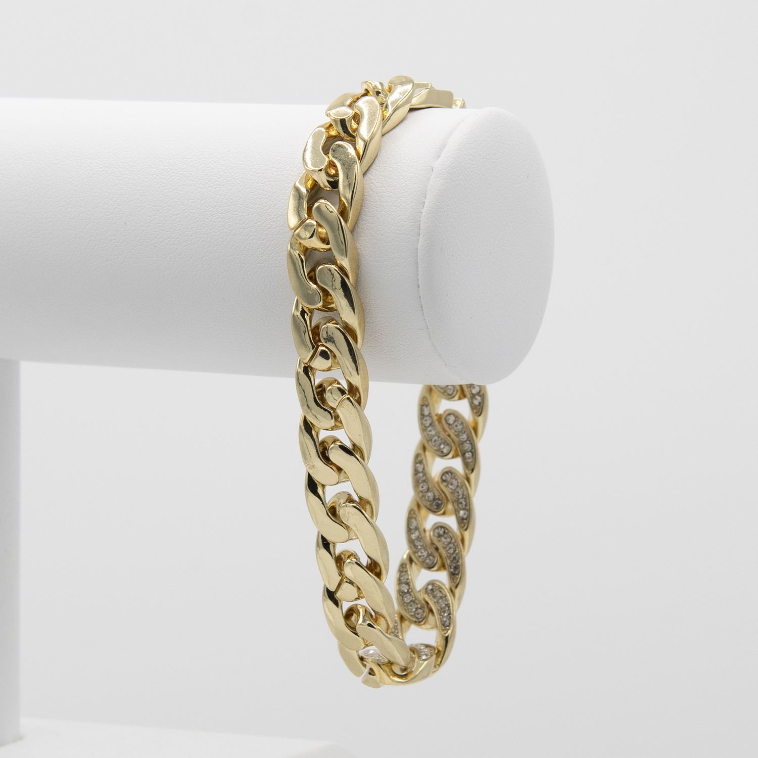 Huge 40.6 Gram 14 Kt Gold Plated Cuban Style Link Bracelet. Complimented by cz accent stones and a healthy approx. 10 mm. Thick.8 1/2 Long.14 Kt Gold Stamp.