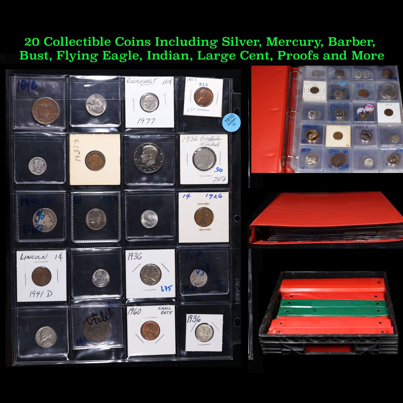 Huge Liifetime Collection - Too Many Coins To Auction Individually - This Lot is For One Page of 20 Coins - All US, No Foreign WOW!. We have received a huge collection of over 10 thousand US coins in flips, 2x2 holders, and 20 coin pages. We are forced, due to limited lots, to sell this collection in pages of 20 coins. All of the pages include Silver Coins. Most contain Indian Cents, Proof Coins, Barber Coinage, Bust Coinage, Lincoln Cents, Flying Eagles, Jefferson Nickels, Roosevelt Dimes, Buffalo Nickels, Eisenhower Dollars, Kennedy Halves, Large Cents including some Draped Bust Large Cents, Mercury Dimes, and Liberty V Nickels. These pages could not be reviewed by anyone in our office due to time constraints. We estimate the value of each page to meet or exceed $200 in value! Good luck and happy hunting.