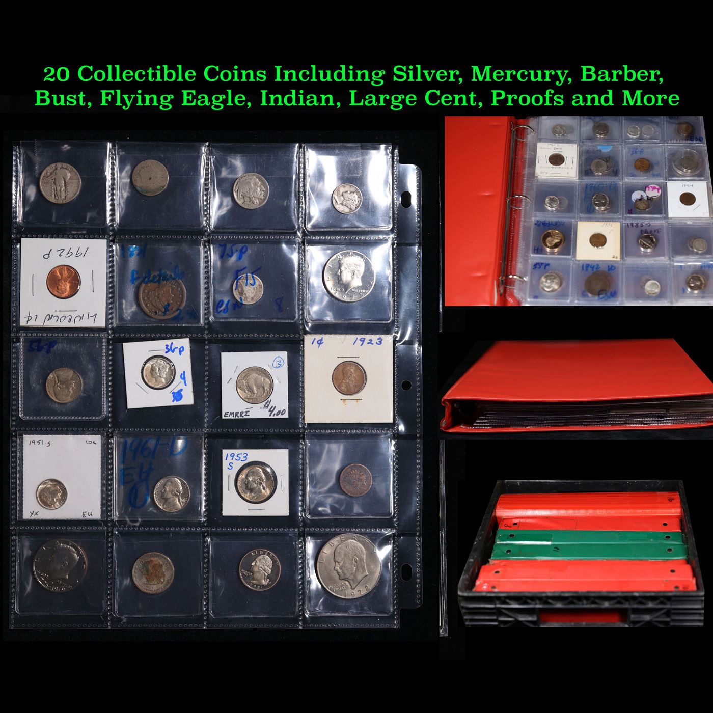 Huge Liifetime Collection - Too Many Coins To Auction Individually - This Lot is For One Page of 20 Coins - All US, No Foreign WOW!. We have received a huge collection of over 10 thousand US coins in flips, 2x2 holders, and 20 coin pages. We are forced, due to limited lots, to sell this collection in pages of 20 coins. All of the pages include Silver Coins. Most contain Indian Cents, Proof Coins, Barber Coinage, Bust Coinage, Lincoln Cents, Flying Eagles, Jefferson Nickels, Roosevelt Dimes, Buffalo Nickels, Eisenhower Dollars, Kennedy Halves, Large Cents including some Draped Bust Large Cents, Mercury Dimes, and Liberty V Nickels. These pages could not be reviewed by anyone in our office due to time constraints. We estimate the value of each page to meet or exceed $200 in value! Good luck and happy hunting.