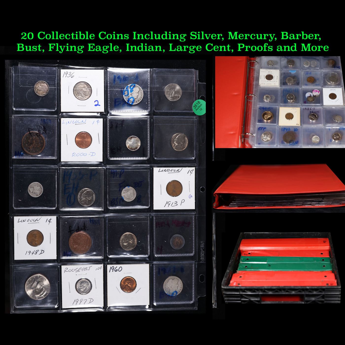 Huge Liifetime Collection - Too Many Coins To Auction Individually - This Lot is For One Page of 20 Coins - All US, No Foreign WOW!. We have received a huge collection of over 10 thousand US coins in flips, 2x2 holders, and 20 coin pages. We are forced, due to limited lots, to sell this collection in pages of 20 coins. All of the pages include Silver Coins. Most contain Indian Cents, Proof Coins, Barber Coinage, Bust Coinage, Lincoln Cents, Flying Eagles, Jefferson Nickels, Roosevelt Dimes, Buffalo Nickels, Eisenhower Dollars, Kennedy Halves, Large Cents including some Draped Bust Large Cents, Mercury Dimes, and Liberty V Nickels. These pages could not be reviewed by anyone in our office due to time constraints. We estimate the value of each page to meet or exceed $200 in value! Good luck and happy hunting.