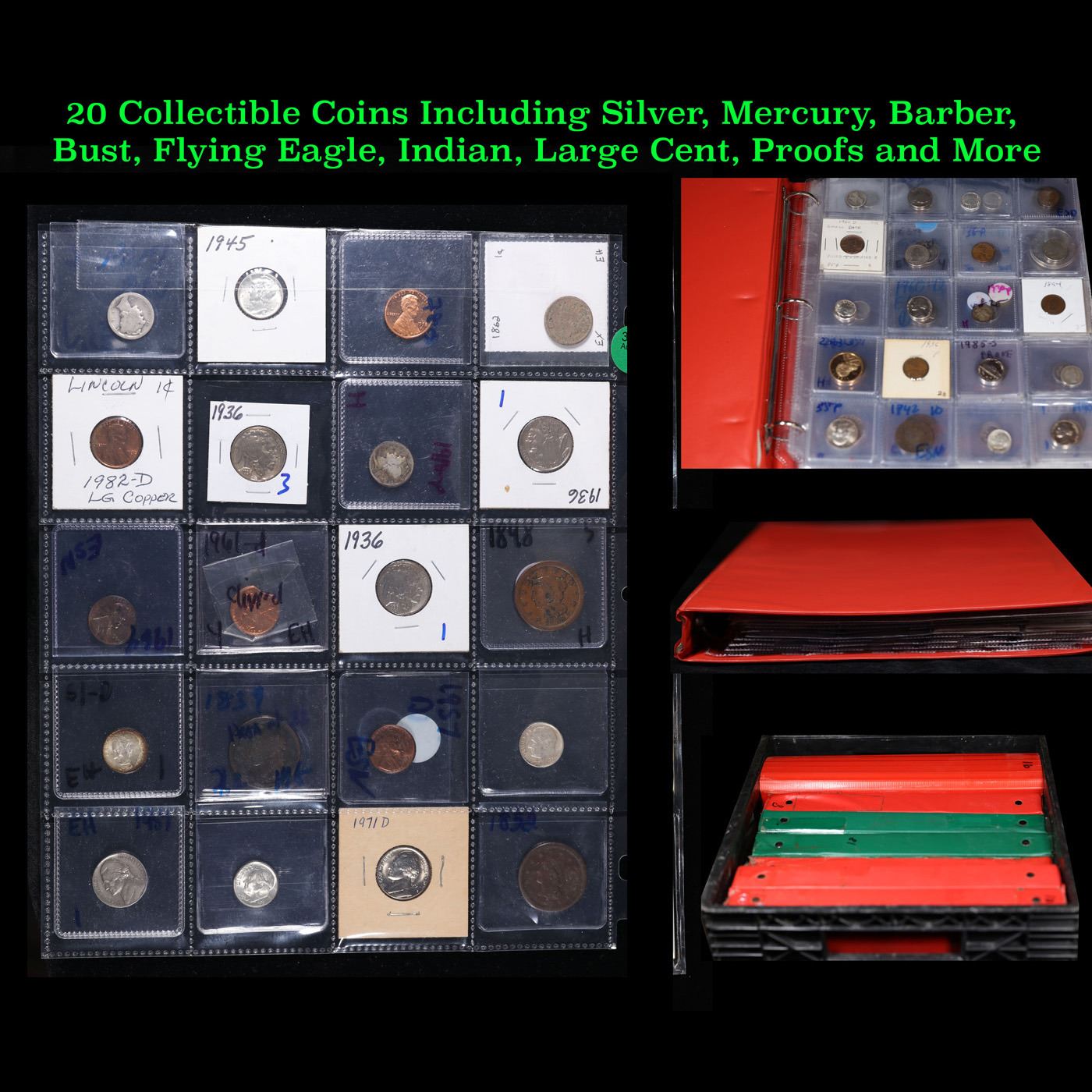 Huge Liifetime Collection - Too Many Coins To Auction Individually - This Lot is For One Page of 20 Coins - All US, No Foreign WOW!. We have received a huge collection of over 10 thousand US coins in flips, 2x2 holders, and 20 coin pages. We are forced, due to limited lots, to sell this collection in pages of 20 coins. All of the pages include Silver Coins. Most contain Indian Cents, Proof Coins, Barber Coinage, Bust Coinage, Lincoln Cents, Flying Eagles, Jefferson Nickels, Roosevelt Dimes, Buffalo Nickels, Eisenhower Dollars, Kennedy Halves, Large Cents including some Draped Bust Large Cents, Mercury Dimes, and Liberty V Nickels. These pages could not be reviewed by anyone in our office due to time constraints. We estimate the value of each page to meet or exceed $200 in value! Good luck and happy hunting.