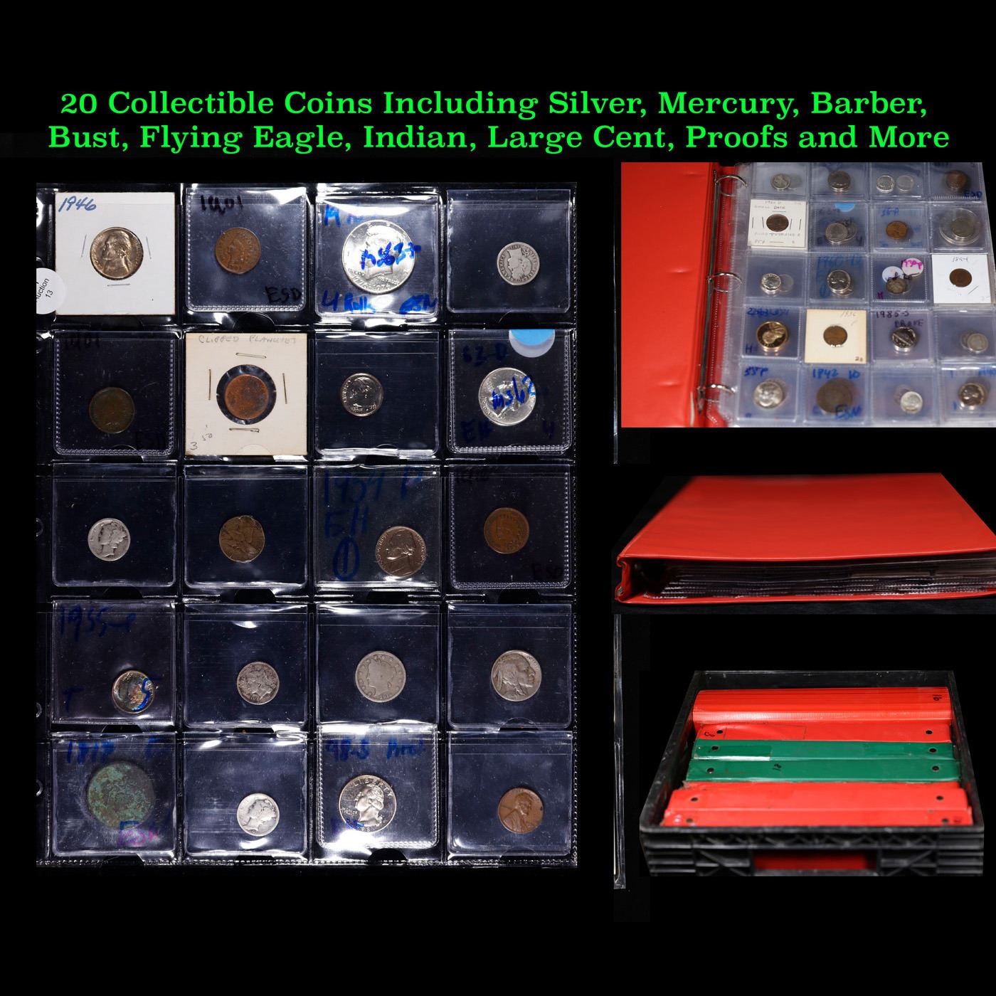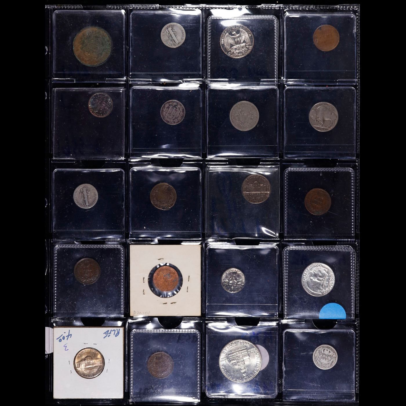 Huge Liifetime Collection - Too Many Coins To Auction Individually - This Lot is For One Page of 20 Coins - All US, No Foreign WOW!. We have received a huge collection of over 10 thousand US coins in flips, 2x2 holders, and 20 coin pages. We are forced, due to limited lots, to sell this collection in pages of 20 coins. All of the pages include Silver Coins. Most contain Indian Cents, Proof Coins, Barber Coinage, Bust Coinage, Lincoln Cents, Flying Eagles, Jefferson Nickels, Roosevelt Dimes, Buffalo Nickels, Eisenhower Dollars, Kennedy Halves, Large Cents including some Draped Bust Large Cents, Mercury Dimes, and Liberty V Nickels. These pages could not be reviewed by anyone in our office due to time constraints. We estimate the value of each page to meet or exceed $200 in value! Good luck and happy hunting.