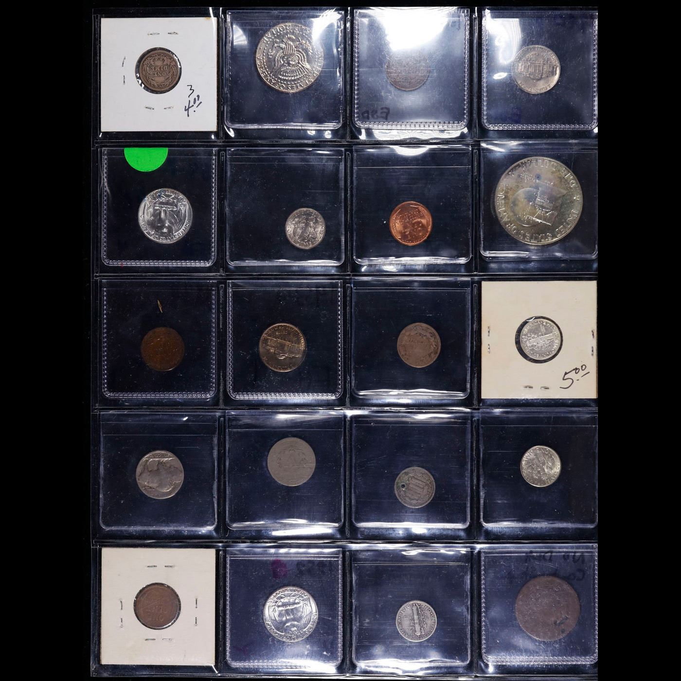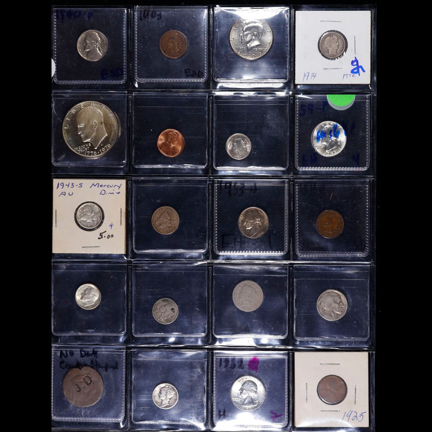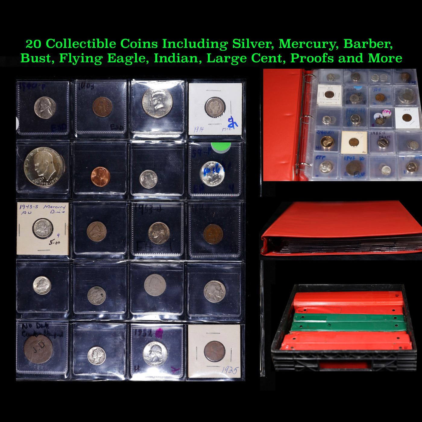 Huge Liifetime Collection - Too Many Coins To Auction Individually - This Lot is For One Page of 20 Coins - All US, No Foreign WOW!. We have received a huge collection of over 10 thousand US coins in flips, 2x2 holders, and 20 coin pages. We are forced, due to limited lots, to sell this collection in pages of 20 coins. All of the pages include Silver Coins. Most contain Indian Cents, Proof Coins, Barber Coinage, Bust Coinage, Lincoln Cents, Flying Eagles, Jefferson Nickels, Roosevelt Dimes, Buffalo Nickels, Eisenhower Dollars, Kennedy Halves, Large Cents including some Draped Bust Large Cents, Mercury Dimes, and Liberty V Nickels. These pages could not be reviewed by anyone in our office due to time constraints. We estimate the value of each page to meet or exceed $200 in value! Good luck and happy hunting.