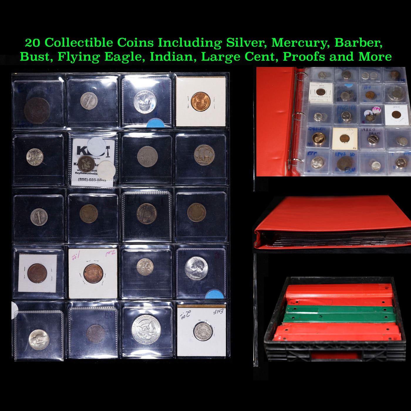 Huge Liifetime Collection - Too Many Coins To Auction Individually - This Lot is For One Page of 20 Coins - All US, No Foreign WOW!. We have received a huge collection of over 10 thousand US coins in flips, 2x2 holders, and 20 coin pages. We are forced, due to limited lots, to sell this collection in pages of 20 coins. All of the pages include Silver Coins. Most contain Indian Cents, Proof Coins, Barber Coinage, Bust Coinage, Lincoln Cents, Flying Eagles, Jefferson Nickels, Roosevelt Dimes, Buffalo Nickels, Eisenhower Dollars, Kennedy Halves, Large Cents including some Draped Bust Large Cents, Mercury Dimes, and Liberty V Nickels. These pages could not be reviewed by anyone in our office due to time constraints. We estimate the value of each page to meet or exceed $200 in value! Good luck and happy hunting.
