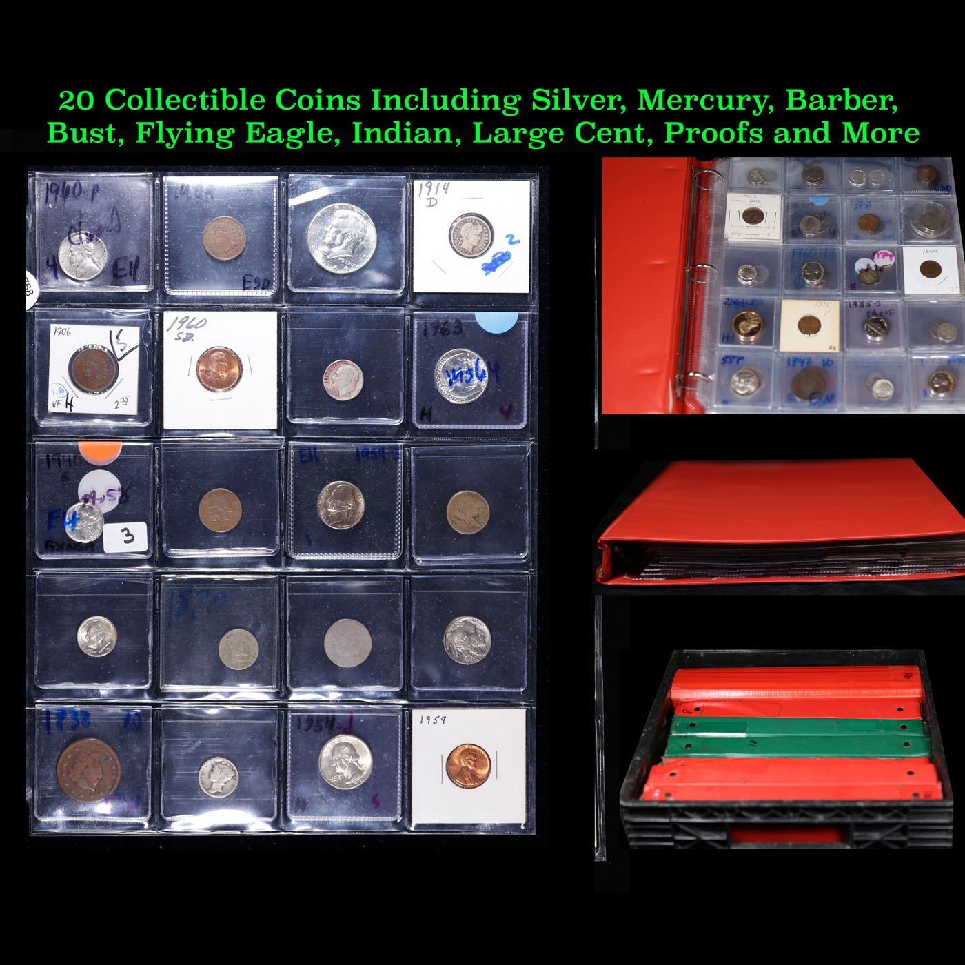 Huge Liifetime Collection - Too Many Coins To Auction Individually - This Lot is For One Page of 20 Coins - All US, No Foreign WOW!. We have received a huge collection of over 10 thousand US coins in flips, 2x2 holders, and 20 coin pages. We are forced, due to limited lots, to sell this collection in pages of 20 coins. All of the pages include Silver Coins. Most contain Indian Cents, Proof Coins, Barber Coinage, Bust Coinage, Lincoln Cents, Flying Eagles, Jefferson Nickels, Roosevelt Dimes, Buffalo Nickels, Eisenhower Dollars, Kennedy Halves, Large Cents including some Draped Bust Large Cents, Mercury Dimes, and Liberty V Nickels. These pages could not be reviewed by anyone in our office due to time constraints. We estimate the value of each page to meet or exceed $200 in value! Good luck and happy hunting.