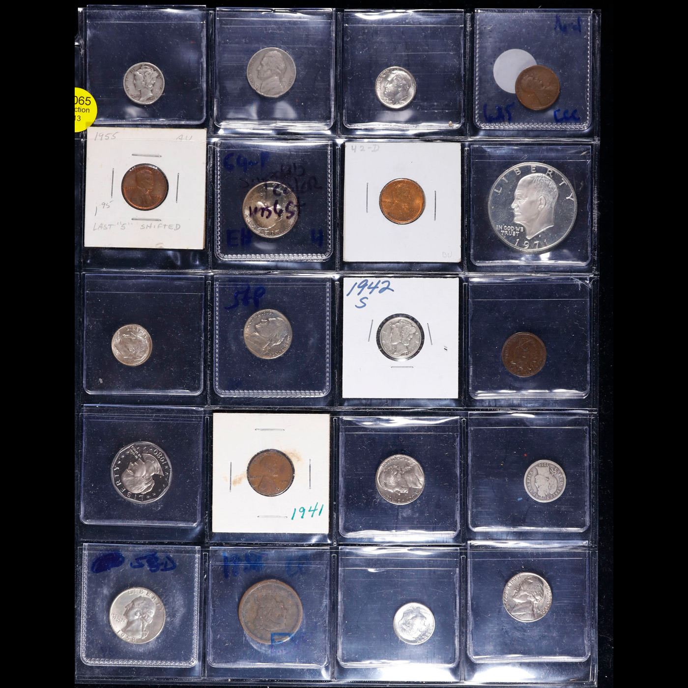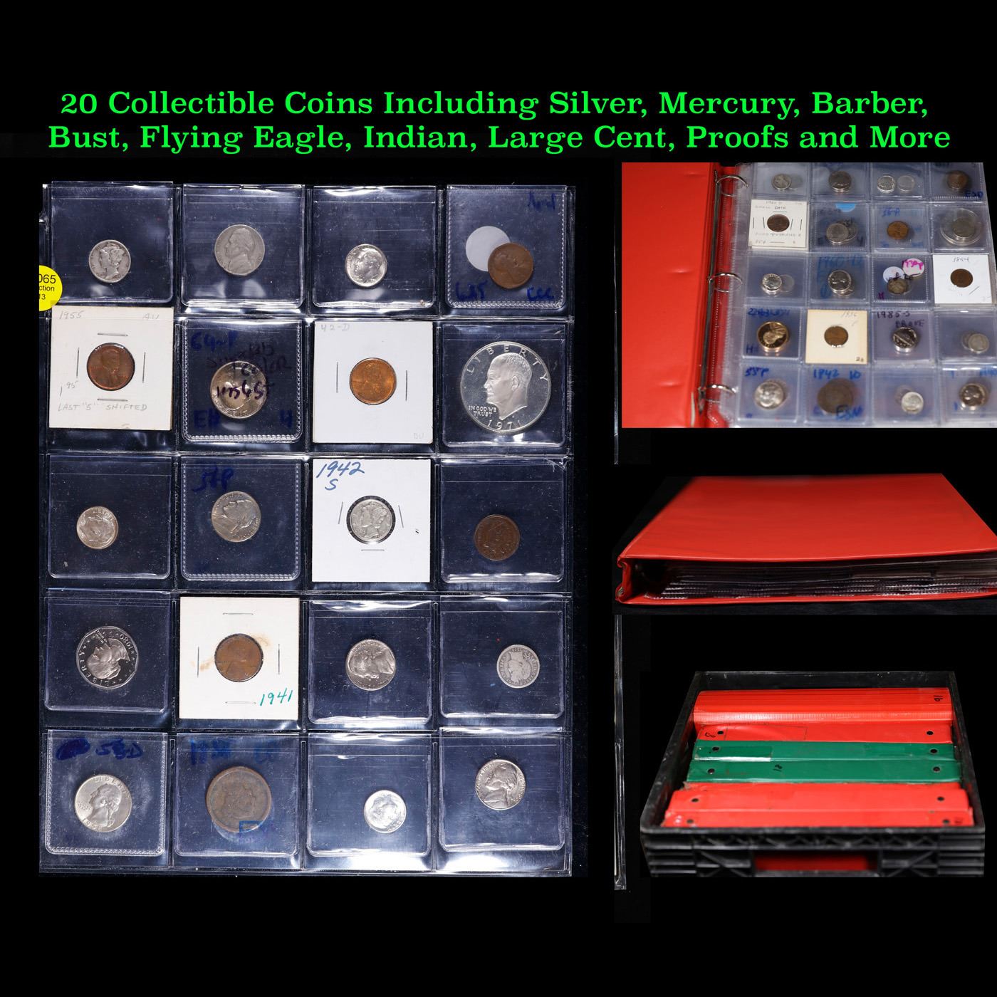 Huge Liifetime Collection - Too Many Coins To Auction Individually - This Lot is For One Page of 20 Coins - All US, No Foreign WOW!. We have received a huge collection of over 10 thousand US coins in flips, 2x2 holders, and 20 coin pages. We are forced, due to limited lots, to sell this collection in pages of 20 coins. All of the pages include Silver Coins. Most contain Indian Cents, Proof Coins, Barber Coinage, Bust Coinage, Lincoln Cents, Flying Eagles, Jefferson Nickels, Roosevelt Dimes, Buffalo Nickels, Eisenhower Dollars, Kennedy Halves, Large Cents including some Draped Bust Large Cents, Mercury Dimes, and Liberty V Nickels. These pages could not be reviewed by anyone in our office due to time constraints. We estimate the value of each page to meet or exceed $200 in value! Good luck and happy hunting.