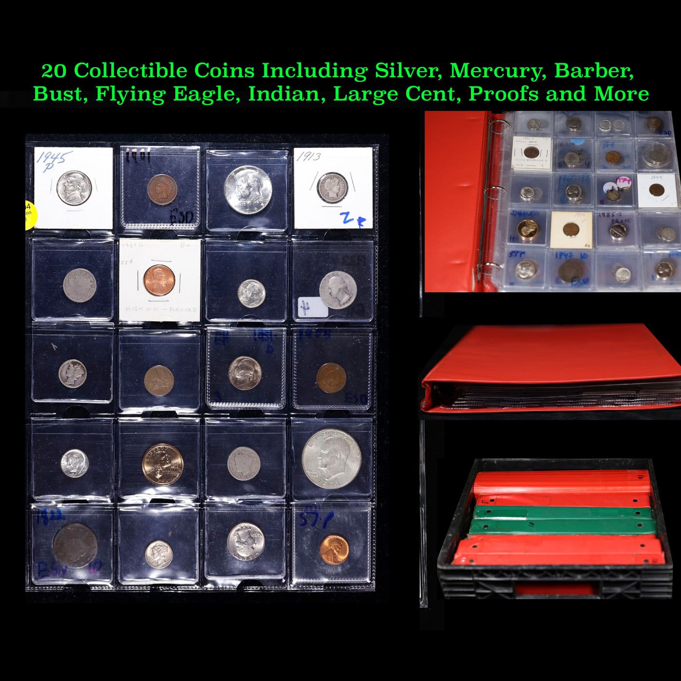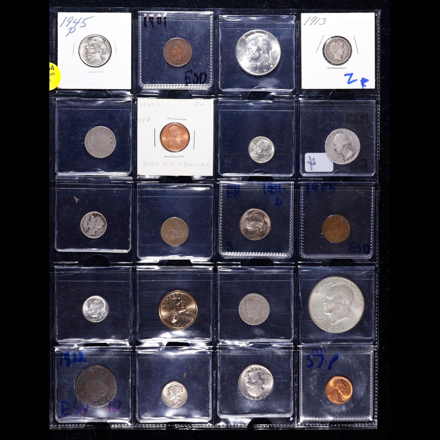 Huge Liifetime Collection - Too Many Coins To Auction Individually - This Lot is For One Page of 20 Coins - All US, No Foreign WOW!. We have received a huge collection of over 10 thousand US coins in flips, 2x2 holders, and 20 coin pages. We are forced, due to limited lots, to sell this collection in pages of 20 coins. All of the pages include Silver Coins. Most contain Indian Cents, Proof Coins, Barber Coinage, Bust Coinage, Lincoln Cents, Flying Eagles, Jefferson Nickels, Roosevelt Dimes, Buffalo Nickels, Eisenhower Dollars, Kennedy Halves, Large Cents including some Draped Bust Large Cents, Mercury Dimes, and Liberty V Nickels. These pages could not be reviewed by anyone in our office due to time constraints. We estimate the value of each page to meet or exceed $200 in value! Good luck and happy hunting.