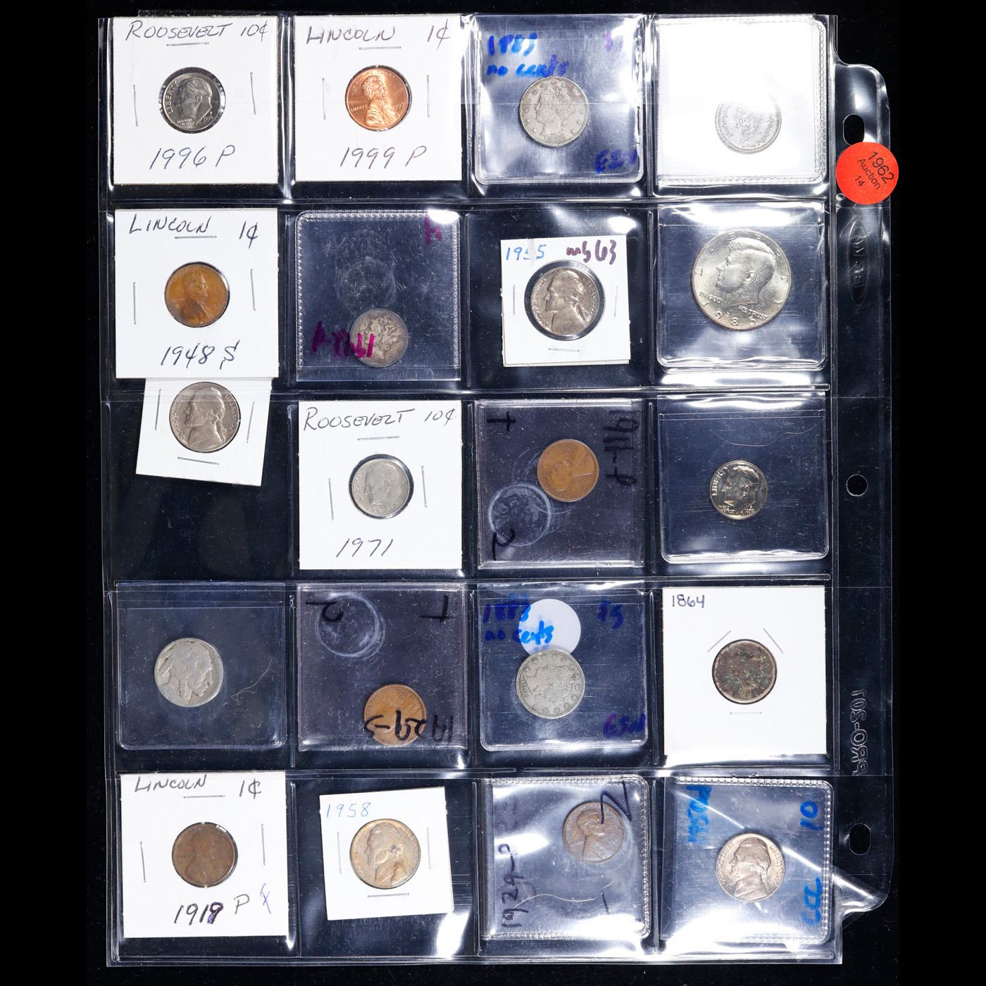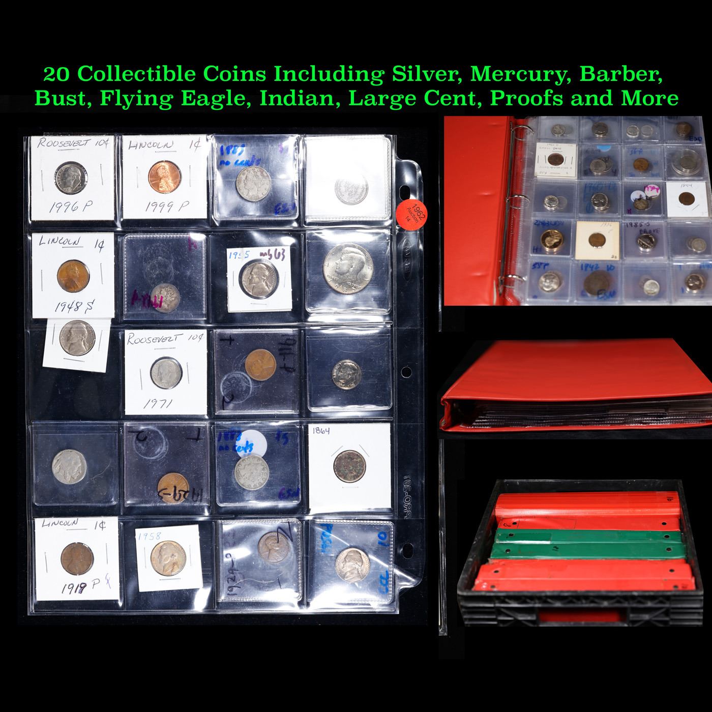 Huge Liifetime Collection - Too Many Coins To Auction Individually - This Lot is For One Page of 20 Coins - All US, No Foreign WOW!. We have received a huge collection of over 10 thousand US coins in flips, 2x2 holders, and 20 coin pages. We are forced, due to limited lots, to sell this collection in pages of 20 coins. All of the pages include Silver Coins. Most contain Indian Cents, Proof Coins, Barber Coinage, Bust Coinage, Lincoln Cents, Flying Eagles, Jefferson Nickels, Roosevelt Dimes, Buffalo Nickels, Eisenhower Dollars, Kennedy Halves, Large Cents including some Draped Bust Large Cents, Mercury Dimes, and Liberty V Nickels. These pages could not be reviewed by anyone in our office due to time constraints. We estimate the value of each page to meet or exceed $200 in value! Good luck and happy hunting.