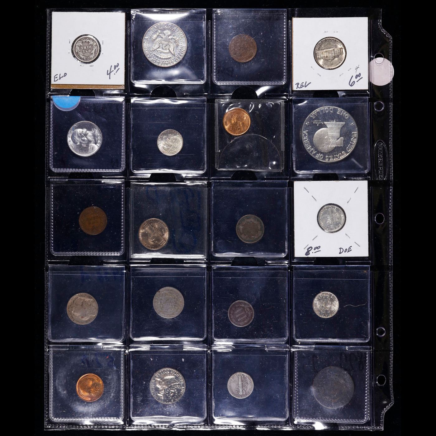 Huge Liifetime Collection - Too Many Coins To Auction Individually - This Lot is For One Page of 20 Coins - All US, No Foreign WOW!. We have received a huge collection of over 10 thousand US coins in flips, 2x2 holders, and 20 coin pages. We are forced, due to limited lots, to sell this collection in pages of 20 coins. All of the pages include Silver Coins. Most contain Indian Cents, Proof Coins, Barber Coinage, Bust Coinage, Lincoln Cents, Flying Eagles, Jefferson Nickels, Roosevelt Dimes, Buffalo Nickels, Eisenhower Dollars, Kennedy Halves, Large Cents including some Draped Bust Large Cents, Mercury Dimes, and Liberty V Nickels. These pages could not be reviewed by anyone in our office due to time constraints. We estimate the value of each page to meet or exceed $200 in value! Good luck and happy hunting.