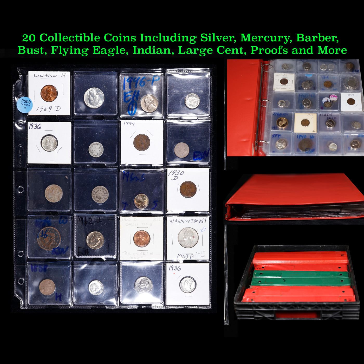Huge Liifetime Collection - Too Many Coins To Auction Individually - This Lot is For One Page of 20 Coins - All US, No Foreign WOW!. We have received a huge collection of over 10 thousand US coins in flips, 2x2 holders, and 20 coin pages. We are forced, due to limited lots, to sell this collection in pages of 20 coins. All of the pages include Silver Coins. Most contain Indian Cents, Proof Coins, Barber Coinage, Bust Coinage, Lincoln Cents, Flying Eagles, Jefferson Nickels, Roosevelt Dimes, Buffalo Nickels, Eisenhower Dollars, Kennedy Halves, Large Cents including some Draped Bust Large Cents, Mercury Dimes, and Liberty V Nickels. These pages could not be reviewed by anyone in our office due to time constraints. We estimate the value of each page to meet or exceed $200 in value! Good luck and happy hunting.