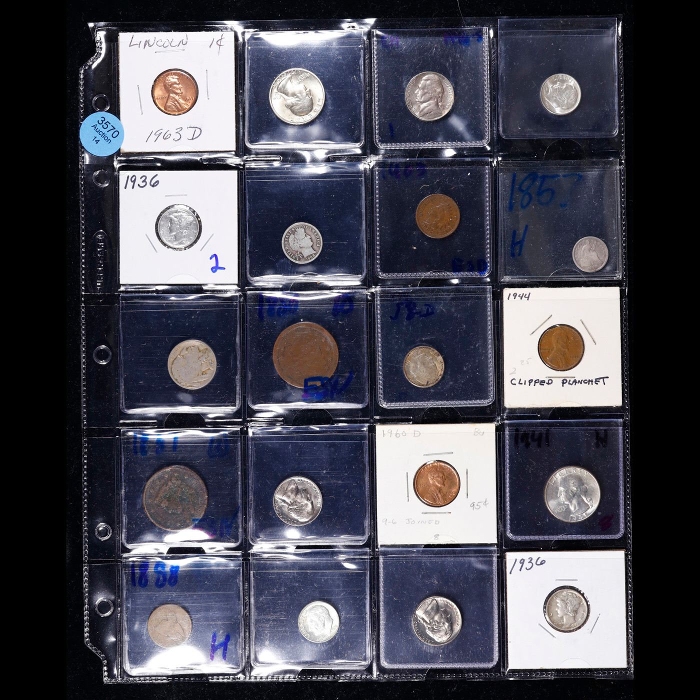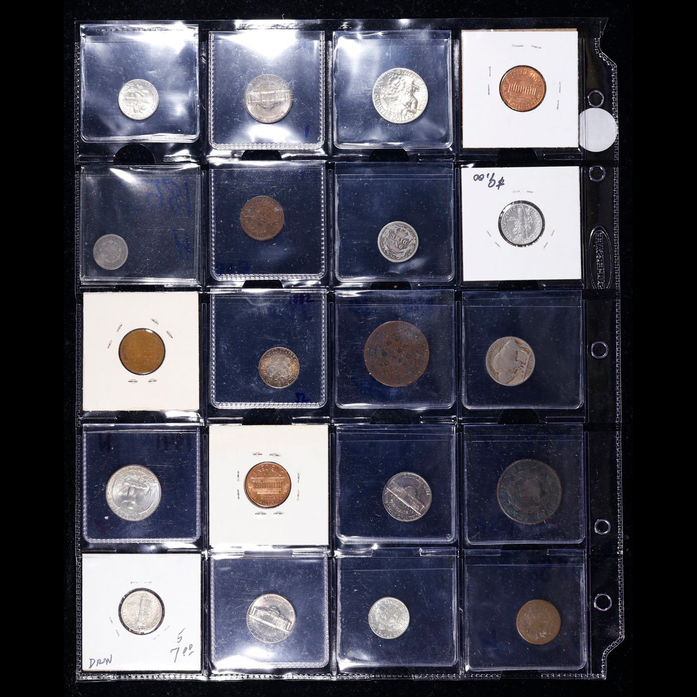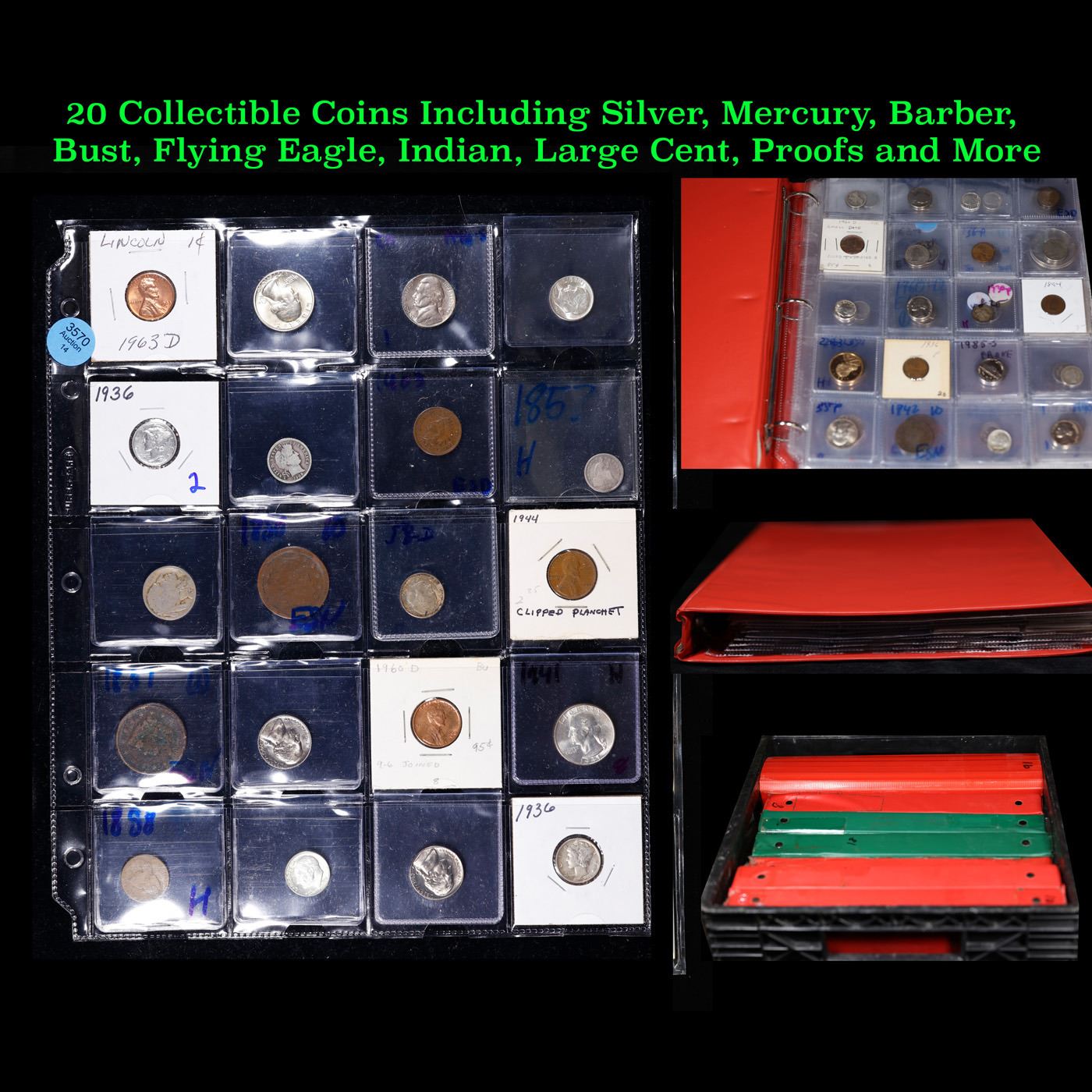 Huge Liifetime Collection - Too Many Coins To Auction Individually - This Lot is For One Page of 20 Coins - All US, No Foreign WOW!. We have received a huge collection of over 10 thousand US coins in flips, 2x2 holders, and 20 coin pages. We are forced, due to limited lots, to sell this collection in pages of 20 coins. All of the pages include Silver Coins. Most contain Indian Cents, Proof Coins, Barber Coinage, Bust Coinage, Lincoln Cents, Flying Eagles, Jefferson Nickels, Roosevelt Dimes, Buffalo Nickels, Eisenhower Dollars, Kennedy Halves, Large Cents including some Draped Bust Large Cents, Mercury Dimes, and Liberty V Nickels. These pages could not be reviewed by anyone in our office due to time constraints. We estimate the value of each page to meet or exceed $200 in value! Good luck and happy hunting.