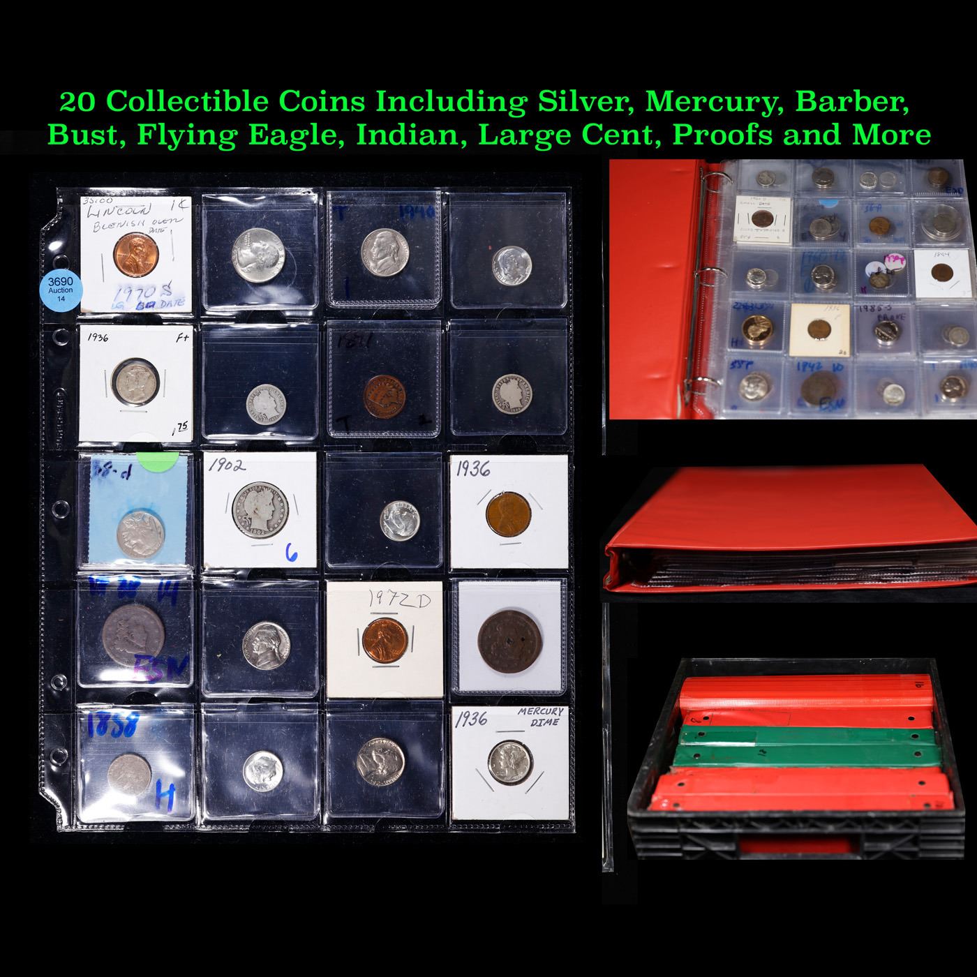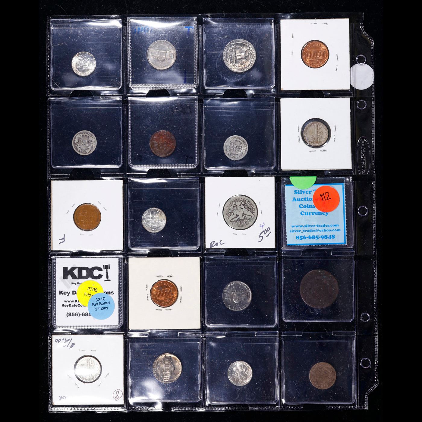Huge Liifetime Collection - Too Many Coins To Auction Individually - This Lot is For One Page of 20 Coins - All US, No Foreign WOW!. We have received a huge collection of over 10 thousand US coins in flips, 2x2 holders, and 20 coin pages. We are forced, due to limited lots, to sell this collection in pages of 20 coins. All of the pages include Silver Coins. Most contain Indian Cents, Proof Coins, Barber Coinage, Bust Coinage, Lincoln Cents, Flying Eagles, Jefferson Nickels, Roosevelt Dimes, Buffalo Nickels, Eisenhower Dollars, Kennedy Halves, Large Cents including some Draped Bust Large Cents, Mercury Dimes, and Liberty V Nickels. These pages could not be reviewed by anyone in our office due to time constraints. We estimate the value of each page to meet or exceed $200 in value! Good luck and happy hunting.