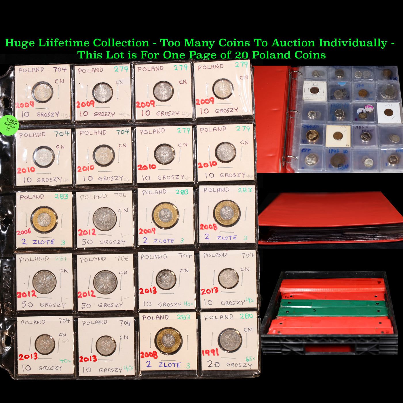 Huge Liifetime Collection - Too Many Coins To Auction Individually - This Lot is For One Page of 20 Poland Coins. We have received a huge collection of over 10 thousand US & Forgin coins in flips, 2x2 holders, and 20 coin pages. We are forced, due to limited lots, to sell this collection in pages of 20 coins. All of these Coins on this Lot Are From Poland. These pages could not be reviewed by anyone in our office due to time constraints. We estimate the value of each page to meet or exceed $200 in value! Good luck and happy hunting.