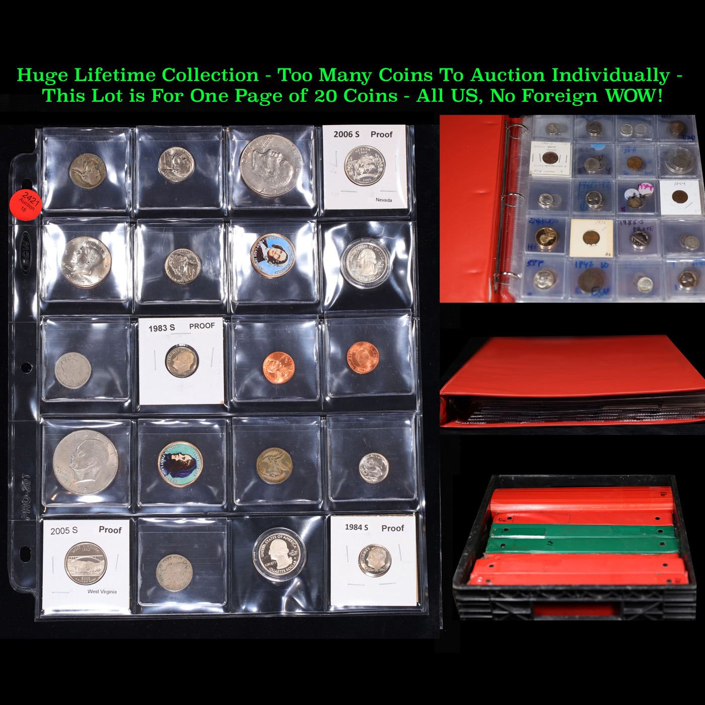 Huge Liifetime Collection - Too Many Coins To Auction Individually - This Lot is For One Page of 20 Coins - All US, No Foreign WOW!. We have received a huge collection of over 10 thousand US coins in flips, 2x2 holders, and 20 coin pages. We are forced, due to limited lots, to sell this collection in pages of 20 coins. All of the pages include Silver Coins. Most contain Indian Cents, Proof Coins, Barber Coinage, Bust Coinage, Lincoln Cents, Flying Eagles, Jefferson Nickels, Roosevelt Dimes, Buffalo Nickels, Eisenhower Dollars, Kennedy Halves, Large Cents including some Draped Bust Large Cents, Mercury Dimes, and Liberty V Nickels. These pages could not be reviewed by anyone in our office due to time constraints. We estimate the value of each page to meet or exceed $200 in value! Good luck and happy hunting.