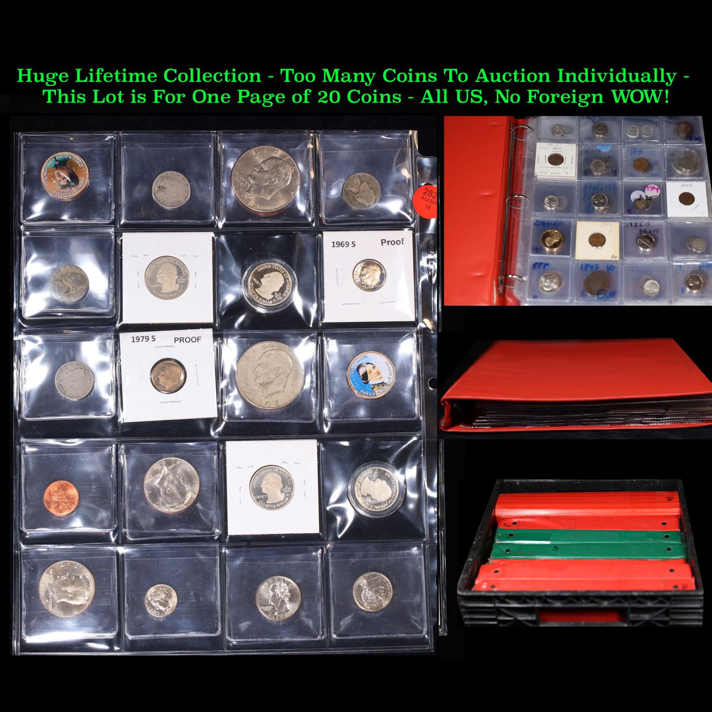 Huge Liifetime Collection - Too Many Coins To Auction Individually - This Lot is For One Page of 20 Coins - All US, No Foreign WOW!. We have received a huge collection of over 10 thousand US coins in flips, 2x2 holders, and 20 coin pages. We are forced, due to limited lots, to sell this collection in pages of 20 coins. All of the pages include Silver Coins. Most contain Indian Cents, Proof Coins, Barber Coinage, Bust Coinage, Lincoln Cents, Flying Eagles, Jefferson Nickels, Roosevelt Dimes, Buffalo Nickels, Eisenhower Dollars, Kennedy Halves, Large Cents including some Draped Bust Large Cents, Mercury Dimes, and Liberty V Nickels. These pages could not be reviewed by anyone in our office due to time constraints. We estimate the value of each page to meet or exceed $200 in value! Good luck and happy hunting.