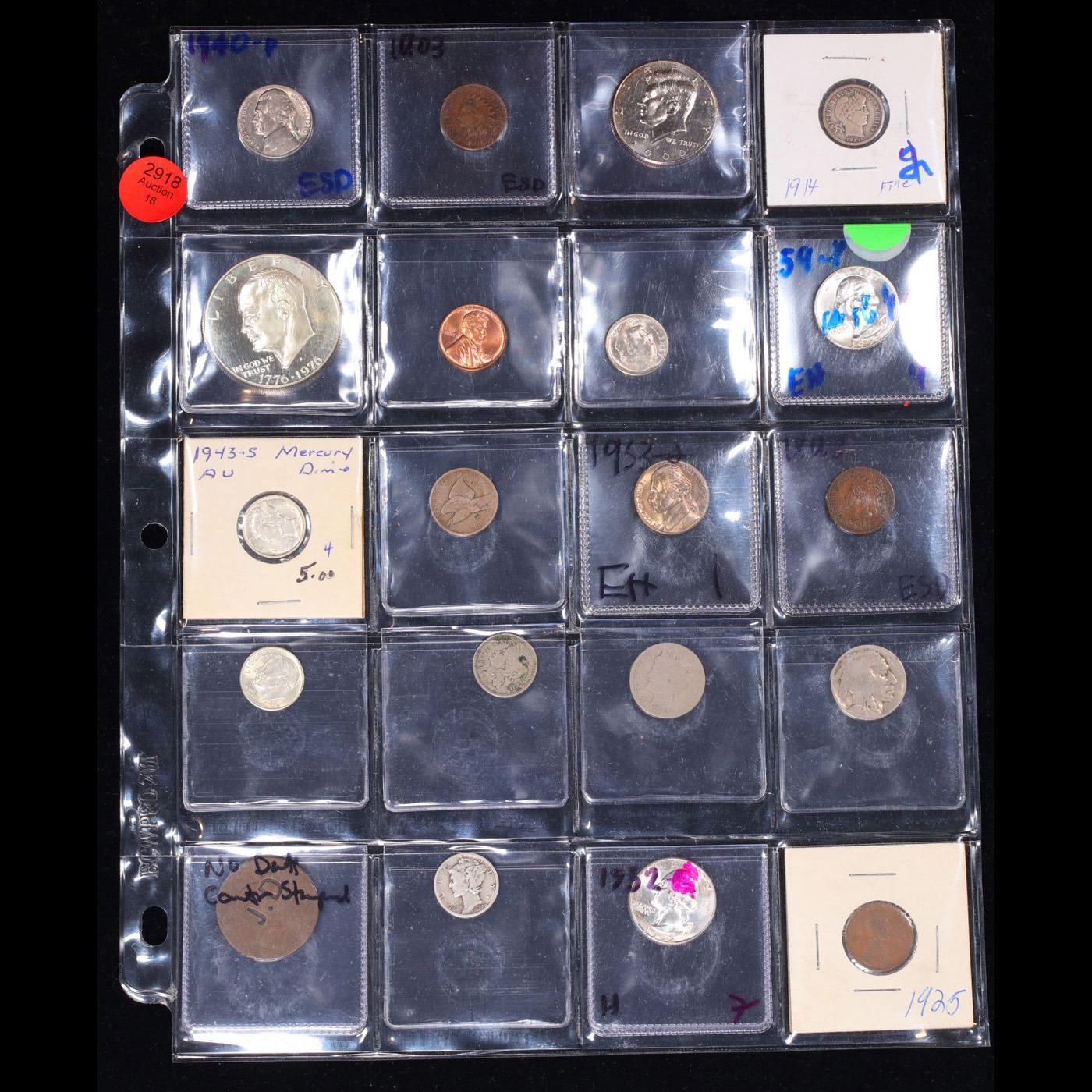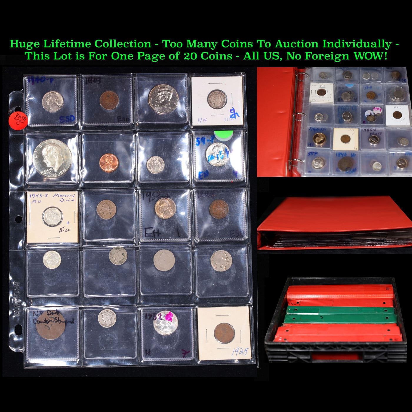 Huge Liifetime Collection - Too Many Coins To Auction Individually - This Lot is For One Page of 20 Coins - All US, No Foreign WOW!. We have received a huge collection of over 10 thousand US coins in flips, 2x2 holders, and 20 coin pages. We are forced, due to limited lots, to sell this collection in pages of 20 coins. All of the pages include Silver Coins. Most contain Indian Cents, Proof Coins, Barber Coinage, Bust Coinage, Lincoln Cents, Flying Eagles, Jefferson Nickels, Roosevelt Dimes, Buffalo Nickels, Eisenhower Dollars, Kennedy Halves, Large Cents including some Draped Bust Large Cents, Mercury Dimes, and Liberty V Nickels. These pages could not be reviewed by anyone in our office due to time constraints. We estimate the value of each page to meet or exceed $200 in value! Good luck and happy hunting.