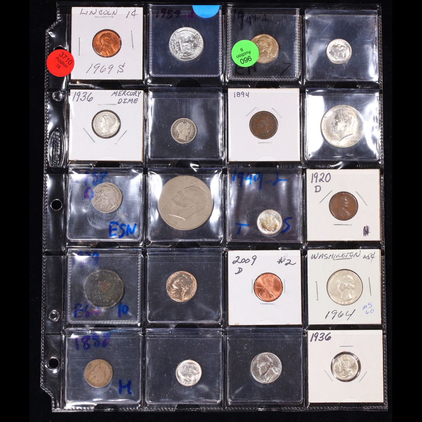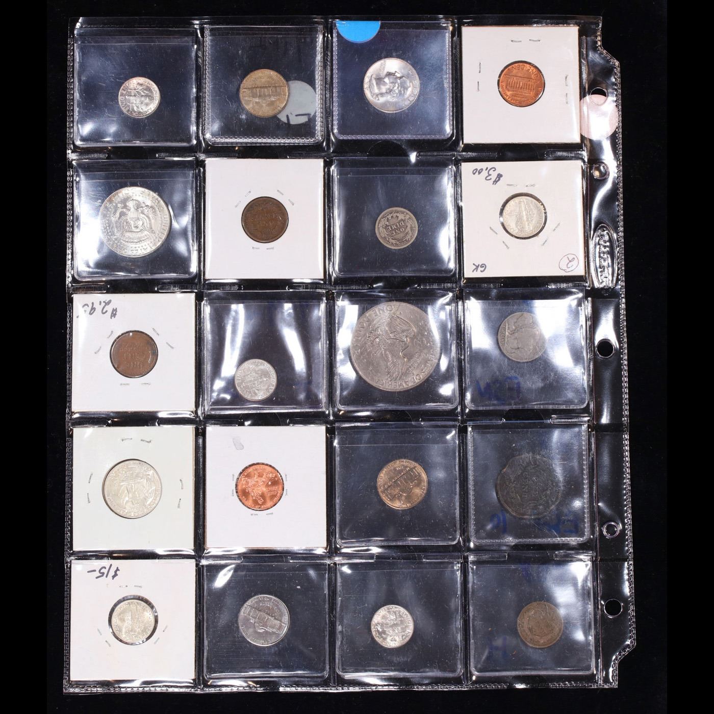 Huge Liifetime Collection - Too Many Coins To Auction Individually - This Lot is For One Page of 20 Coins - All US, No Foreign WOW!. We have received a huge collection of over 10 thousand US coins in flips, 2x2 holders, and 20 coin pages. We are forced, due to limited lots, to sell this collection in pages of 20 coins. All of the pages include Silver Coins. Most contain Indian Cents, Proof Coins, Barber Coinage, Bust Coinage, Lincoln Cents, Flying Eagles, Jefferson Nickels, Roosevelt Dimes, Buffalo Nickels, Eisenhower Dollars, Kennedy Halves, Large Cents including some Draped Bust Large Cents, Mercury Dimes, and Liberty V Nickels. These pages could not be reviewed by anyone in our office due to time constraints. We estimate the value of each page to meet or exceed $200 in value! Good luck and happy hunting.