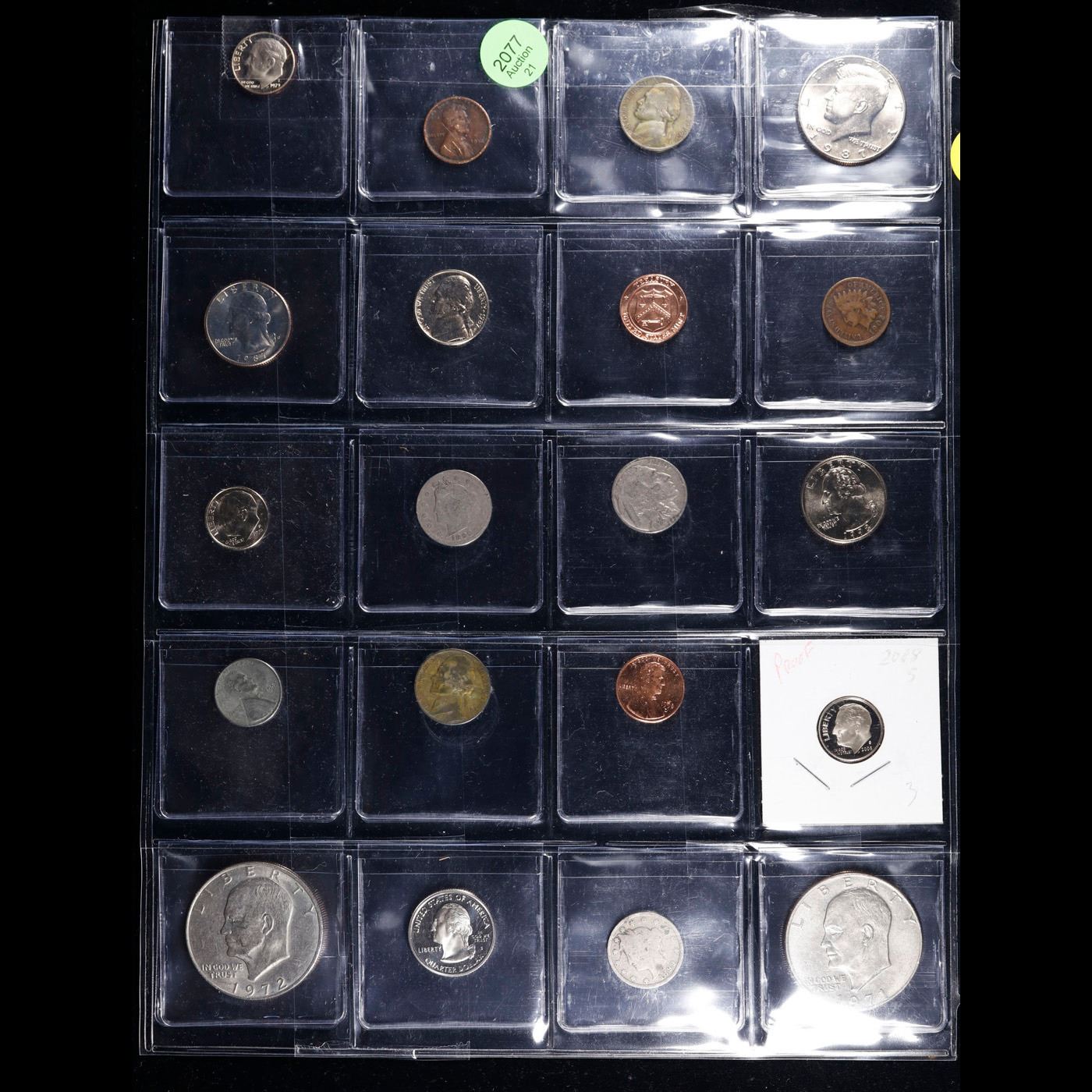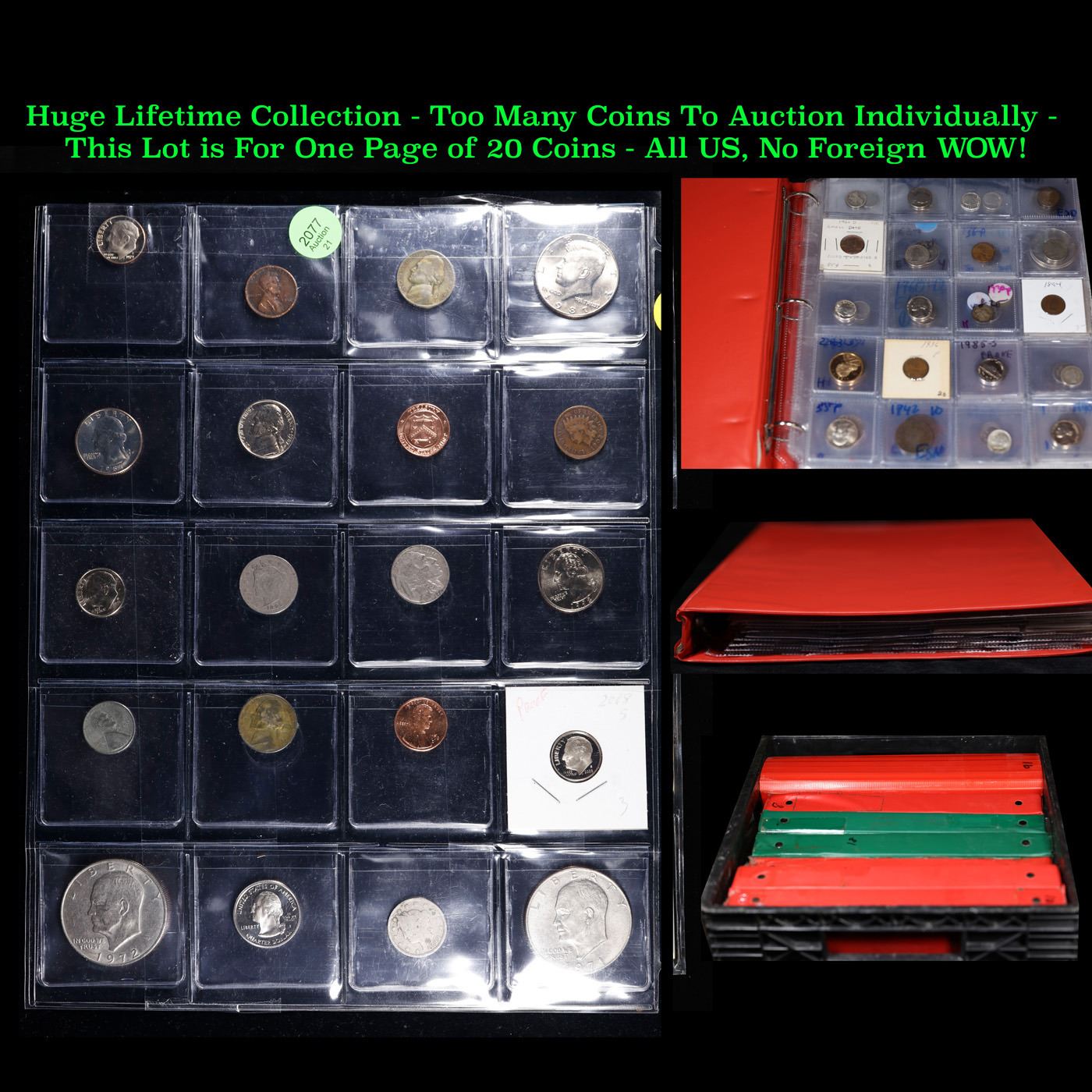Huge Liifetime Collection - Too Many Coins To Auction Individually - This Lot is For One Page of 20 Coins - All US, No Foreign WOW!. We have received a huge collection of over 10 thousand US coins in flips, 2x2 holders, and 20 coin pages. We are forced, due to limited lots, to sell this collection in pages of 20 coins. All of the pages include Silver Coins. Most contain Indian Cents, Proof Coins, Barber Coinage, Bust Coinage, Lincoln Cents, Flying Eagles, Jefferson Nickels, Roosevelt Dimes, Buffalo Nickels, Eisenhower Dollars, Kennedy Halves, Large Cents including some Draped Bust Large Cents, Mercury Dimes, and Liberty V Nickels. These pages could not be reviewed by anyone in our office due to time constraints. We estimate the value of each page to meet or exceed $200 in value! Good luck and happy hunting.