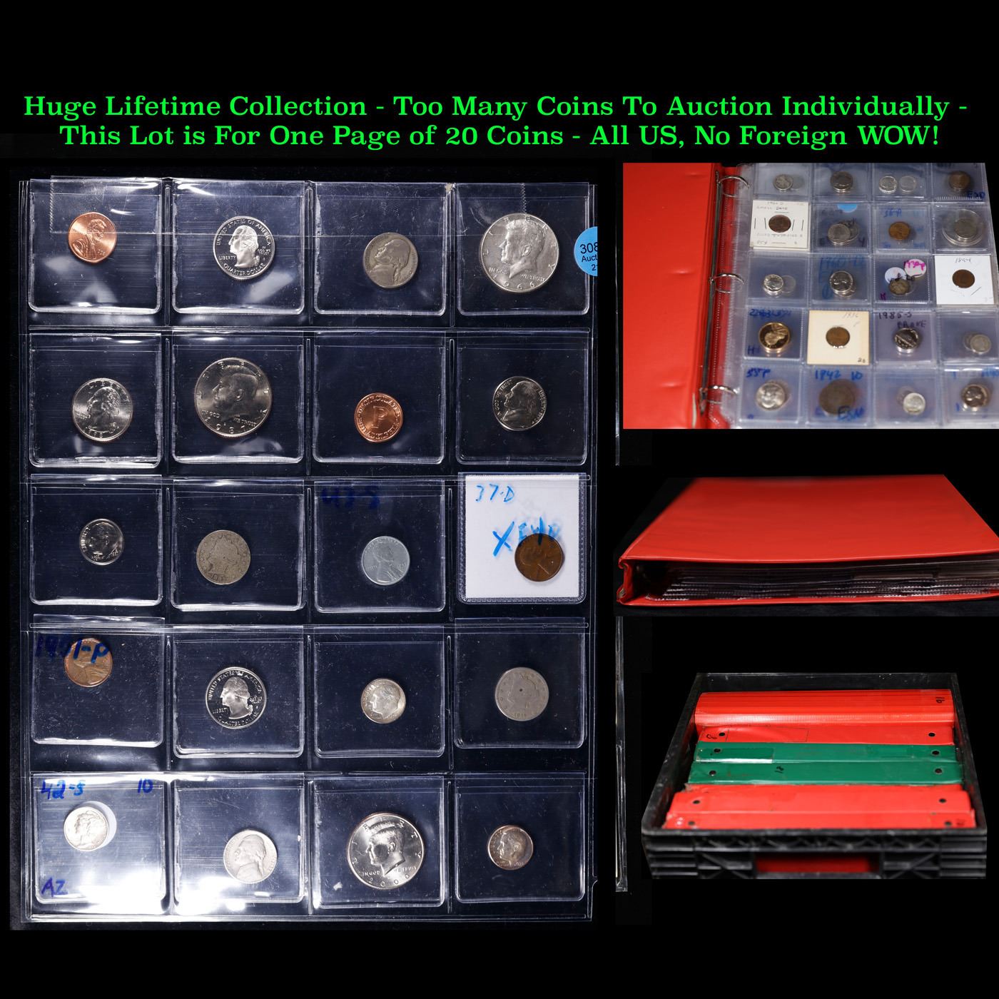 Huge Liifetime Collection - Too Many Coins To Auction Individually - This Lot is For One Page of 20 Coins - All US, No Foreign WOW!. We have received a huge collection of over 10 thousand US coins in flips, 2x2 holders, and 20 coin pages. We are forced, due to limited lots, to sell this collection in pages of 20 coins. All of the pages include Silver Coins. Most contain Indian Cents, Proof Coins, Barber Coinage, Bust Coinage, Lincoln Cents, Flying Eagles, Jefferson Nickels, Roosevelt Dimes, Buffalo Nickels, Eisenhower Dollars, Kennedy Halves, Large Cents including some Draped Bust Large Cents, Mercury Dimes, and Liberty V Nickels. These pages could not be reviewed by anyone in our office due to time constraints. We estimate the value of each page to meet or exceed $200 in value! Good luck and happy hunting.