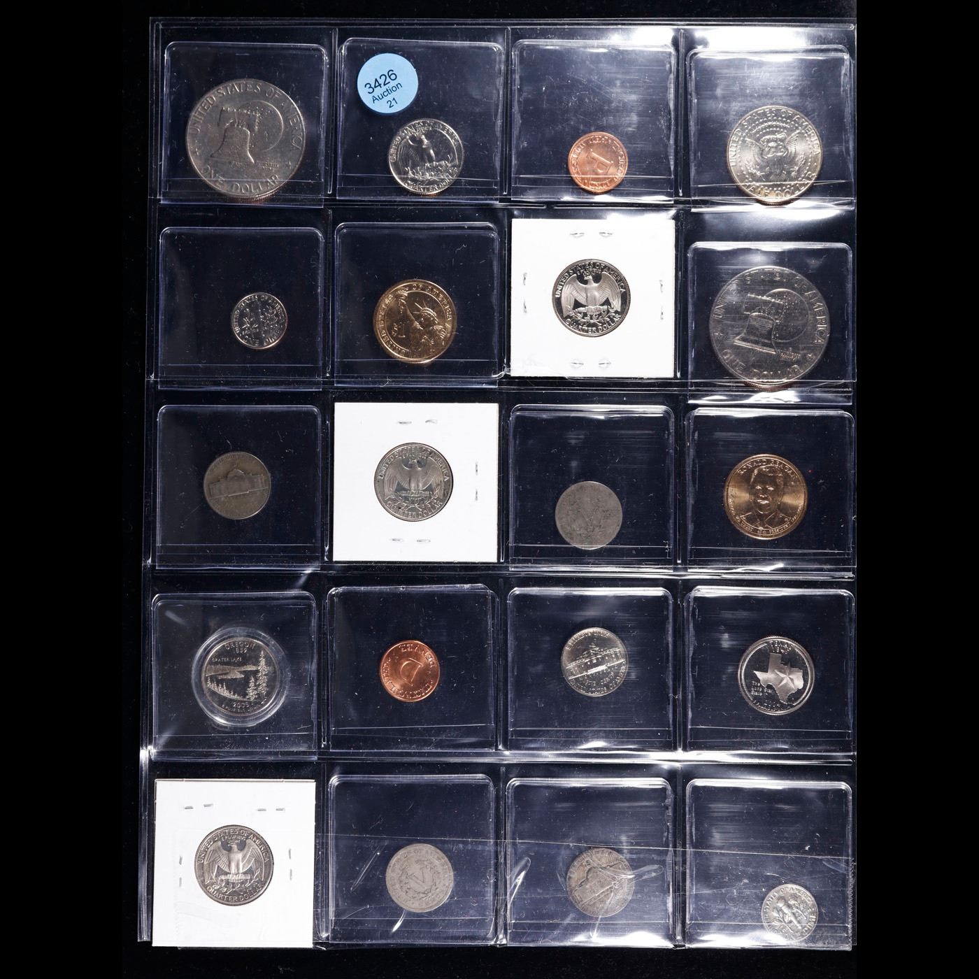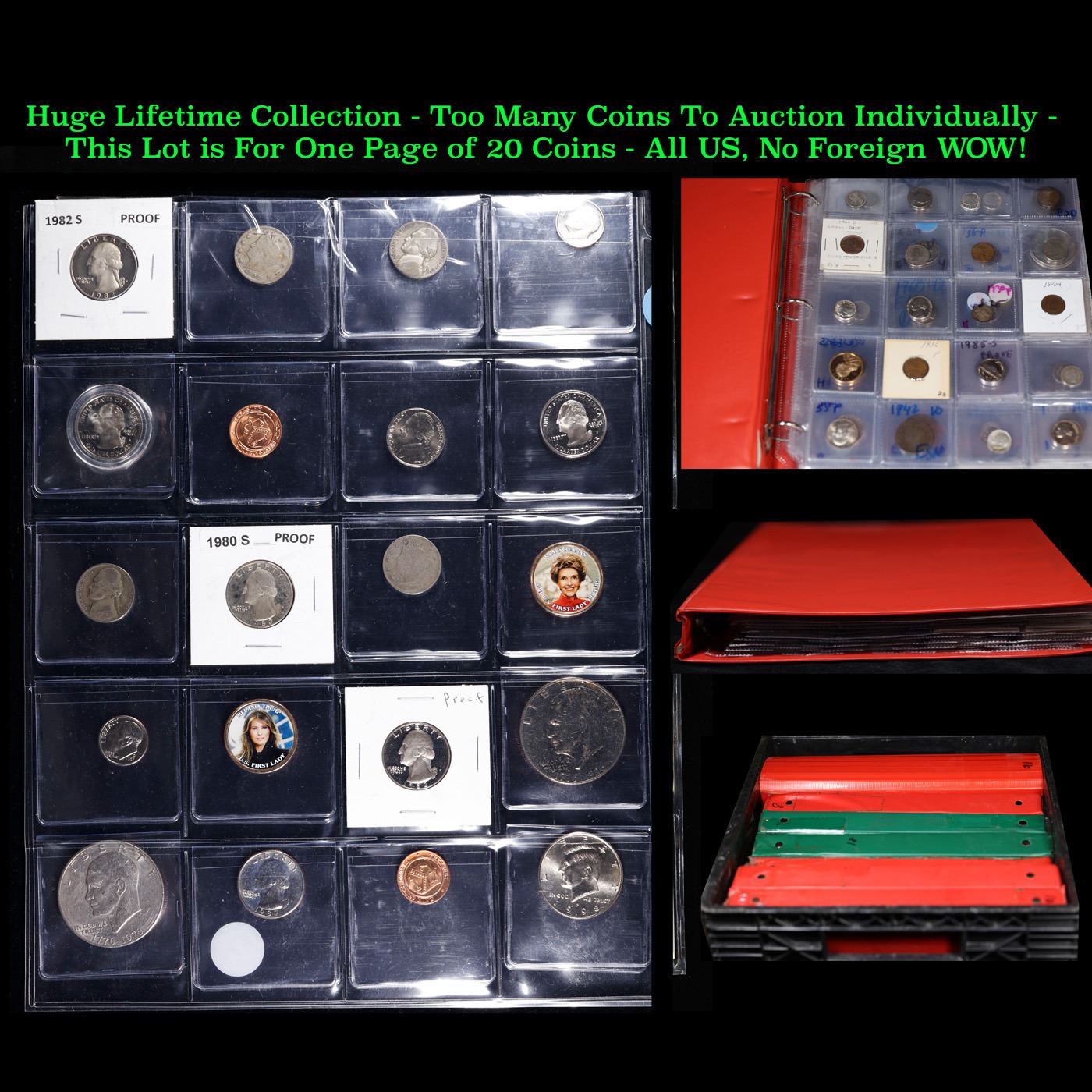 Huge Liifetime Collection - Too Many Coins To Auction Individually - This Lot is For One Page of 20 Coins - All US, No Foreign WOW!. We have received a huge collection of over 10 thousand US coins in flips, 2x2 holders, and 20 coin pages. We are forced, due to limited lots, to sell this collection in pages of 20 coins. All of the pages include Silver Coins. Most contain Indian Cents, Proof Coins, Barber Coinage, Bust Coinage, Lincoln Cents, Flying Eagles, Jefferson Nickels, Roosevelt Dimes, Buffalo Nickels, Eisenhower Dollars, Kennedy Halves, Large Cents including some Draped Bust Large Cents, Mercury Dimes, and Liberty V Nickels. These pages could not be reviewed by anyone in our office due to time constraints. We estimate the value of each page to meet or exceed $200 in value! Good luck and happy hunting.