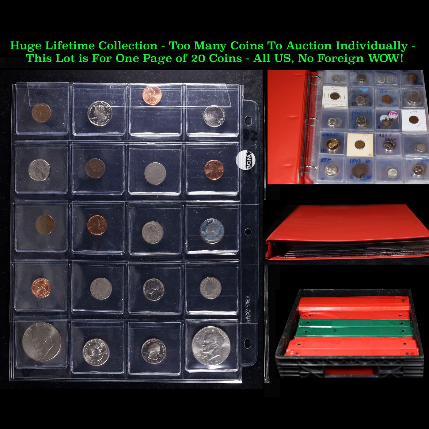 Huge Liifetime Collection - Too Many Coins To Auction Individually - This Lot is For One Page of 20 Coins - All US, No Foreign WOW!. We have received a huge collection of over 10 thousand US coins in flips, 2x2 holders, and 20 coin pages. We are forced, due to limited lots, to sell this collection in pages of 20 coins. All of the pages include Silver Coins. Most contain Indian Cents, Proof Coins, Barber Coinage, Bust Coinage, Lincoln Cents, Flying Eagles, Jefferson Nickels, Roosevelt Dimes, Buffalo Nickels, Eisenhower Dollars, Kennedy Halves, Large Cents including some Draped Bust Large Cents, Mercury Dimes, and Liberty V Nickels. These pages could not be reviewed by anyone in our office due to time constraints. We estimate the value of each page to meet or exceed $200 in value! Good luck and happy hunting.