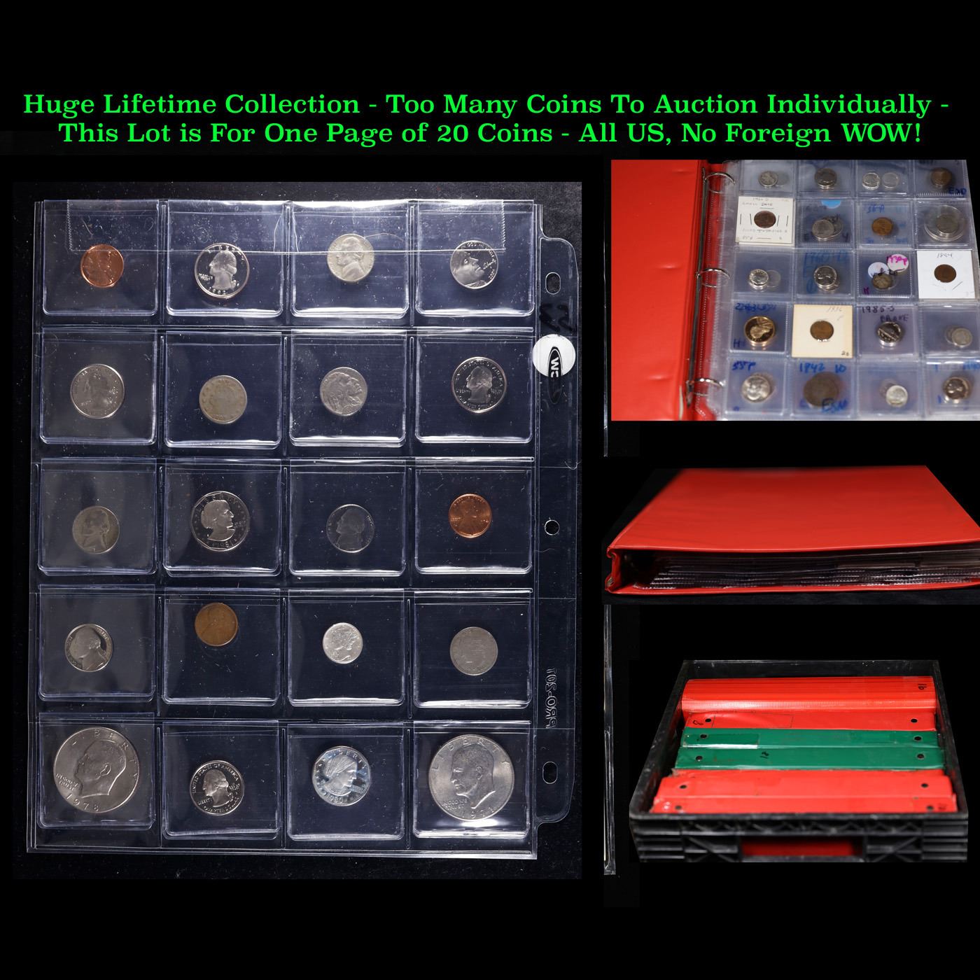 Huge Liifetime Collection - Too Many Coins To Auction Individually - This Lot is For One Page of 20 Coins - All US, No Foreign WOW!. We have received a huge collection of over 10 thousand US coins in flips, 2x2 holders, and 20 coin pages. We are forced, due to limited lots, to sell this collection in pages of 20 coins. All of the pages include Silver Coins. Most contain Indian Cents, Proof Coins, Barber Coinage, Bust Coinage, Lincoln Cents, Flying Eagles, Jefferson Nickels, Roosevelt Dimes, Buffalo Nickels, Eisenhower Dollars, Kennedy Halves, Large Cents including some Draped Bust Large Cents, Mercury Dimes, and Liberty V Nickels. These pages could not be reviewed by anyone in our office due to time constraints. We estimate the value of each page to meet or exceed $200 in value! Good luck and happy hunting.