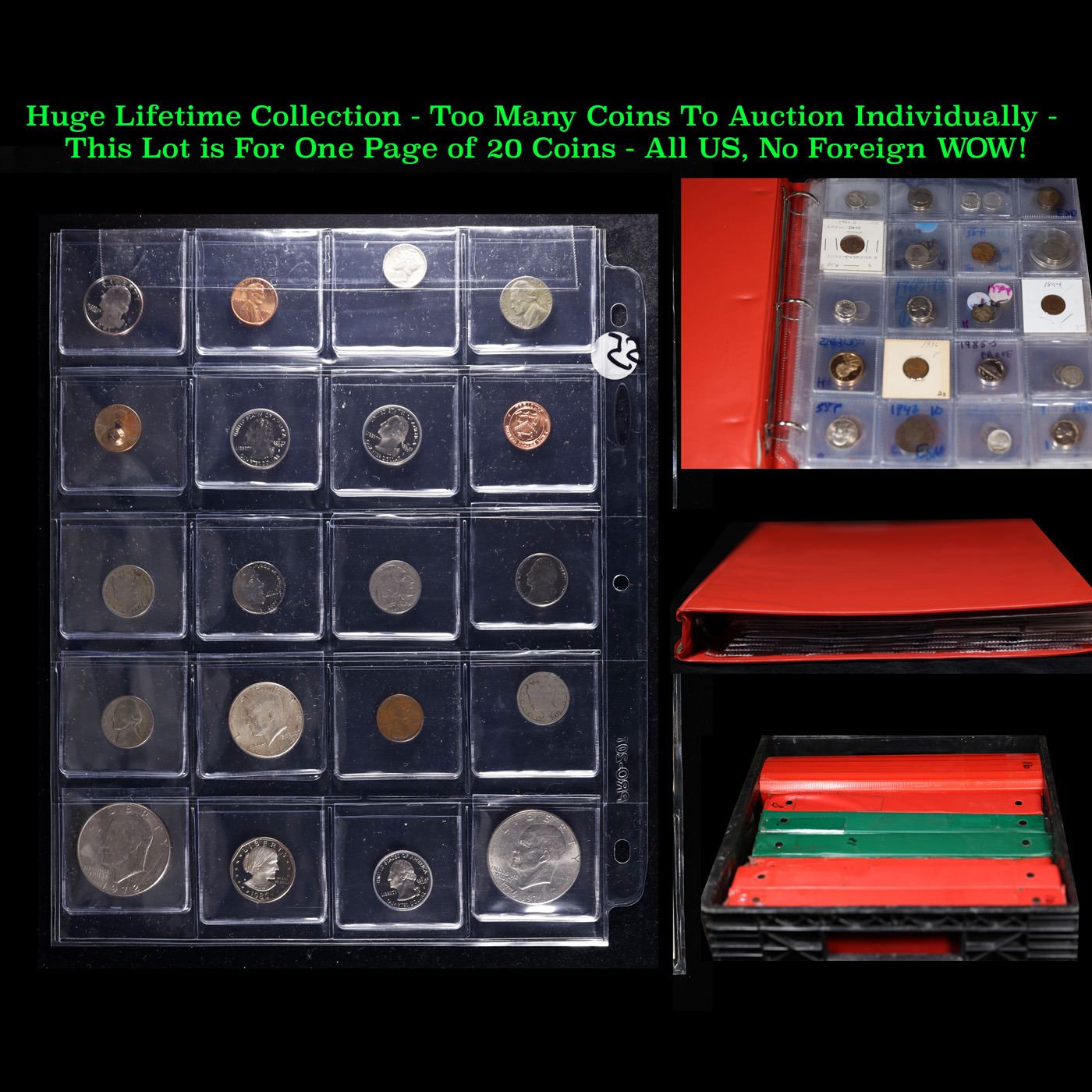 Huge Liifetime Collection - Too Many Coins To Auction Individually - This Lot is For One Page of 20 Coins - All US, No Foreign WOW!. We have received a huge collection of over 10 thousand US coins in flips, 2x2 holders, and 20 coin pages. We are forced, due to limited lots, to sell this collection in pages of 20 coins. All of the pages include Silver Coins. Most contain Indian Cents, Proof Coins, Barber Coinage, Bust Coinage, Lincoln Cents, Flying Eagles, Jefferson Nickels, Roosevelt Dimes, Buffalo Nickels, Eisenhower Dollars, Kennedy Halves, Large Cents including some Draped Bust Large Cents, Mercury Dimes, and Liberty V Nickels. These pages could not be reviewed by anyone in our office due to time constraints. We estimate the value of each page to meet or exceed $200 in value! Good luck and happy hunting.