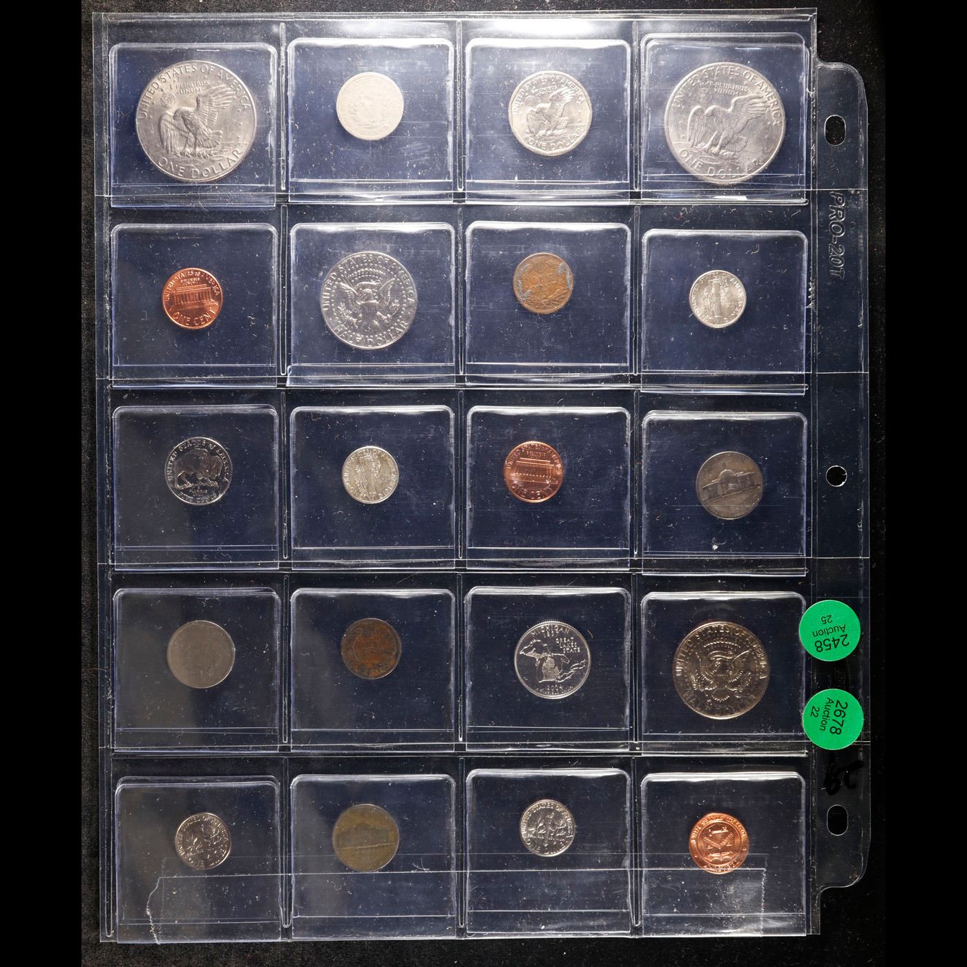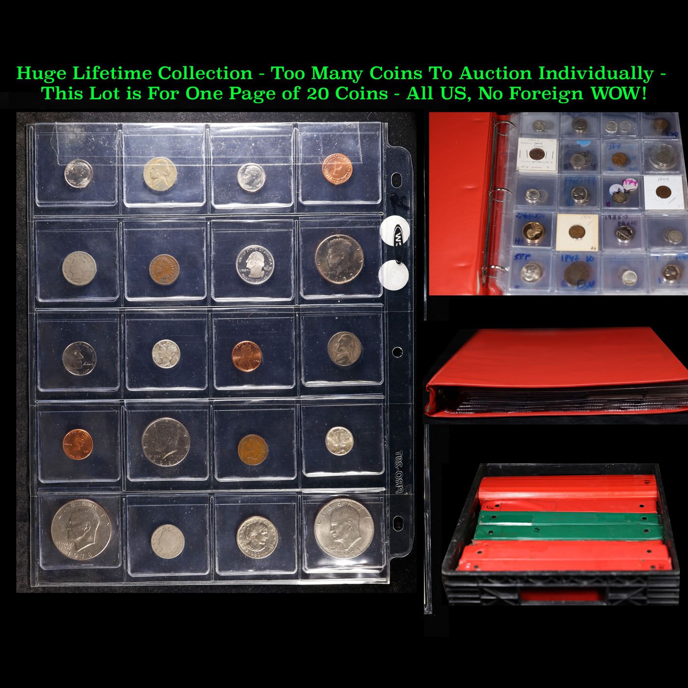 Huge Liifetime Collection - Too Many Coins To Auction Individually - This Lot is For One Page of 20 Coins - All US, No Foreign WOW!. We have received a huge collection of over 10 thousand US coins in flips, 2x2 holders, and 20 coin pages. We are forced, due to limited lots, to sell this collection in pages of 20 coins. All of the pages include Silver Coins. Most contain Indian Cents, Proof Coins, Barber Coinage, Bust Coinage, Lincoln Cents, Flying Eagles, Jefferson Nickels, Roosevelt Dimes, Buffalo Nickels, Eisenhower Dollars, Kennedy Halves, Large Cents including some Draped Bust Large Cents, Mercury Dimes, and Liberty V Nickels. These pages could not be reviewed by anyone in our office due to time constraints. We estimate the value of each page to meet or exceed $200 in value! Good luck and happy hunting.