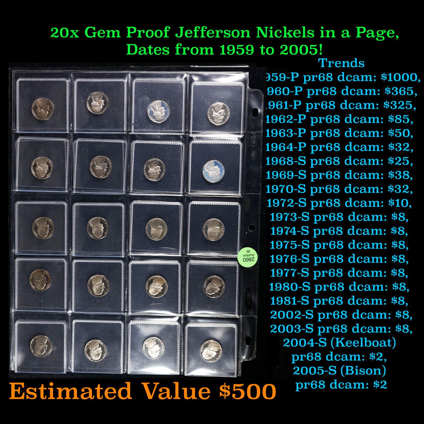 Huge Liifetime Collection - Too Many Coins To Auction Individually - This Lot is For One Page of 20 Proof Jefferson Nickels Dates Range From 1971-2006. We have received a huge collection of over 10 thousand US coins in flips, 2x2 holders, and 20 coin pages. We are forced, due to limited lots, to sell this collection in pages of 20 coins. This Page is For 20 Proof Jefferson Nickels. Trends 1987-s pr69 DCAM $15, 1980-s pr69 DCAM $10, 2006-s pr69 DCAM $15, 1985-s pr69 DCAM $15, 1972-s pr69 DCAM $36, 2002-s pr69 DCAM $15, 1971-s pr69 DCAM $200, 2006-s pr69 DCAM $15, 1981-s pr69 DCAM $20, 1983-s pr69 DCAM $15, 1992-s pr69 DCAM $15, 1992-s pr69 DCAM $15, 1980-s pr69 DCAM $10, 1980-s pr69 DCAM $10, 2001-s pr69 DCAM $15, 1981-s pr69 DCAM $20, 1993-s pr69 DCAM $15, 1985-s pr69 DCAM $15, 1991-s pr69 DCAM $15, 1980-s pr69 DCAM $10. We estimate the value of each page to meet or exceed $200 in value! Good luck and happy hunting.