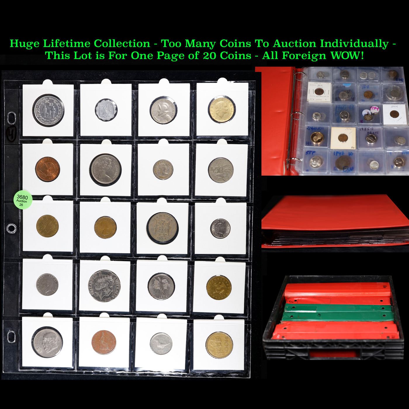 Huge Liifetime Collection - Too Many Coins To Auction Individually - This Lot is For One Page of 20 Foreign Coins. We have received a huge collection of over 10 thousand US coins in flips, 2x2 holders, and 20 coin pages. We are forced, due to limited lots, to sell this collection in pages of 20 coins. All of the pages include Silver Coins. Most contain Indian Cents, Proof Coins, Barber Coinage, Bust Coinage, Lincoln Cents, Flying Eagles, Jefferson Nickels, Roosevelt Dimes, Buffalo Nickels, Eisenhower Dollars, Kennedy Halves, Large Cents including some Draped Bust Large Cents, Mercury Dimes, and Liberty V Nickels. These pages could not be reviewed by anyone in our office due to time constraints. We estimate the value of each page to meet or exceed $200 in value! Good luck and happy hunting.