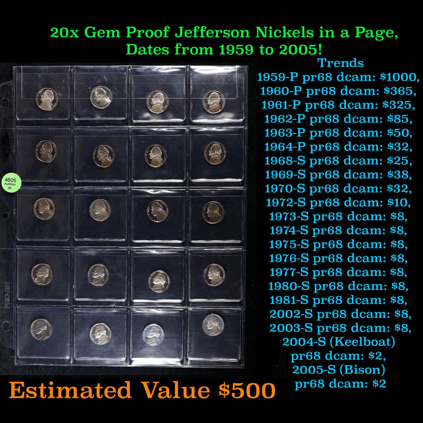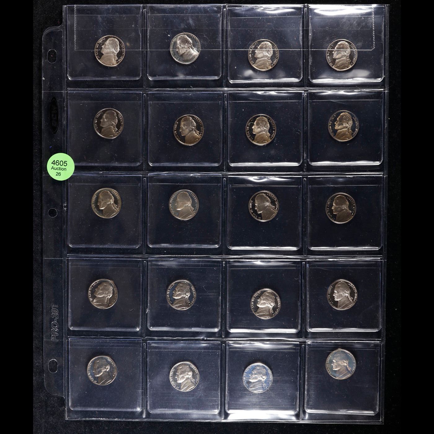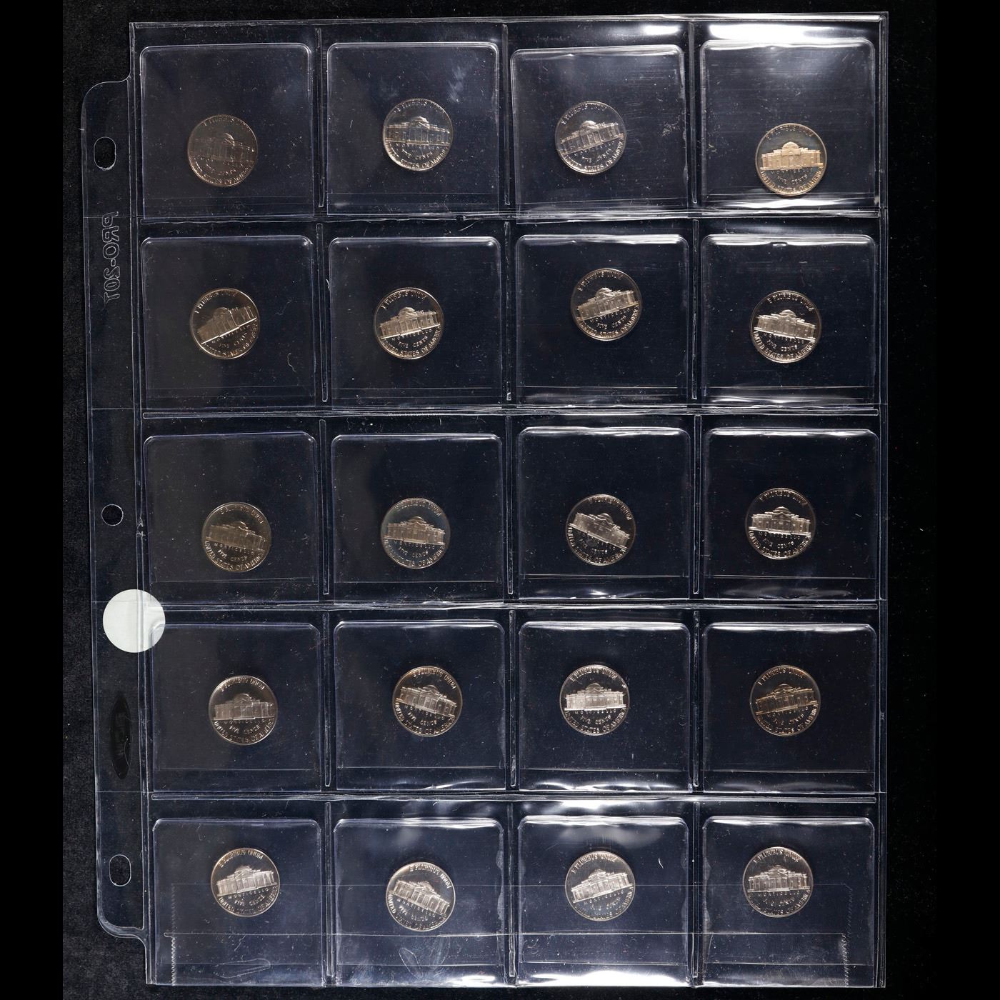 Huge Liifetime Collection - Too Many Coins To Auction Individually - This Lot is For One Page of 20 Proof Jefferson Nickels Dates Range From 1971-2006. We have received a huge collection of over 10 thousand US coins in flips, 2x2 holders, and 20 coin pages. We are forced, due to limited lots, to sell this collection in pages of 20 coins. This Page is For 20 Proof Jefferson Nickels. Trends 1987-s pr69 DCAM $15, 1980-s pr69 DCAM $10, 2006-s pr69 DCAM $15, 1985-s pr69 DCAM $15, 1972-s pr69 DCAM $36, 2002-s pr69 DCAM $15, 1971-s pr69 DCAM $200, 2006-s pr69 DCAM $15, 1981-s pr69 DCAM $20, 1983-s pr69 DCAM $15, 1992-s pr69 DCAM $15, 1992-s pr69 DCAM $15, 1980-s pr69 DCAM $10, 1980-s pr69 DCAM $10, 2001-s pr69 DCAM $15, 1981-s pr69 DCAM $20, 1993-s pr69 DCAM $15, 1985-s pr69 DCAM $15, 1991-s pr69 DCAM $15, 1980-s pr69 DCAM $10. We estimate the value of each page to meet or exceed $200 in value! Good luck and happy hunting.