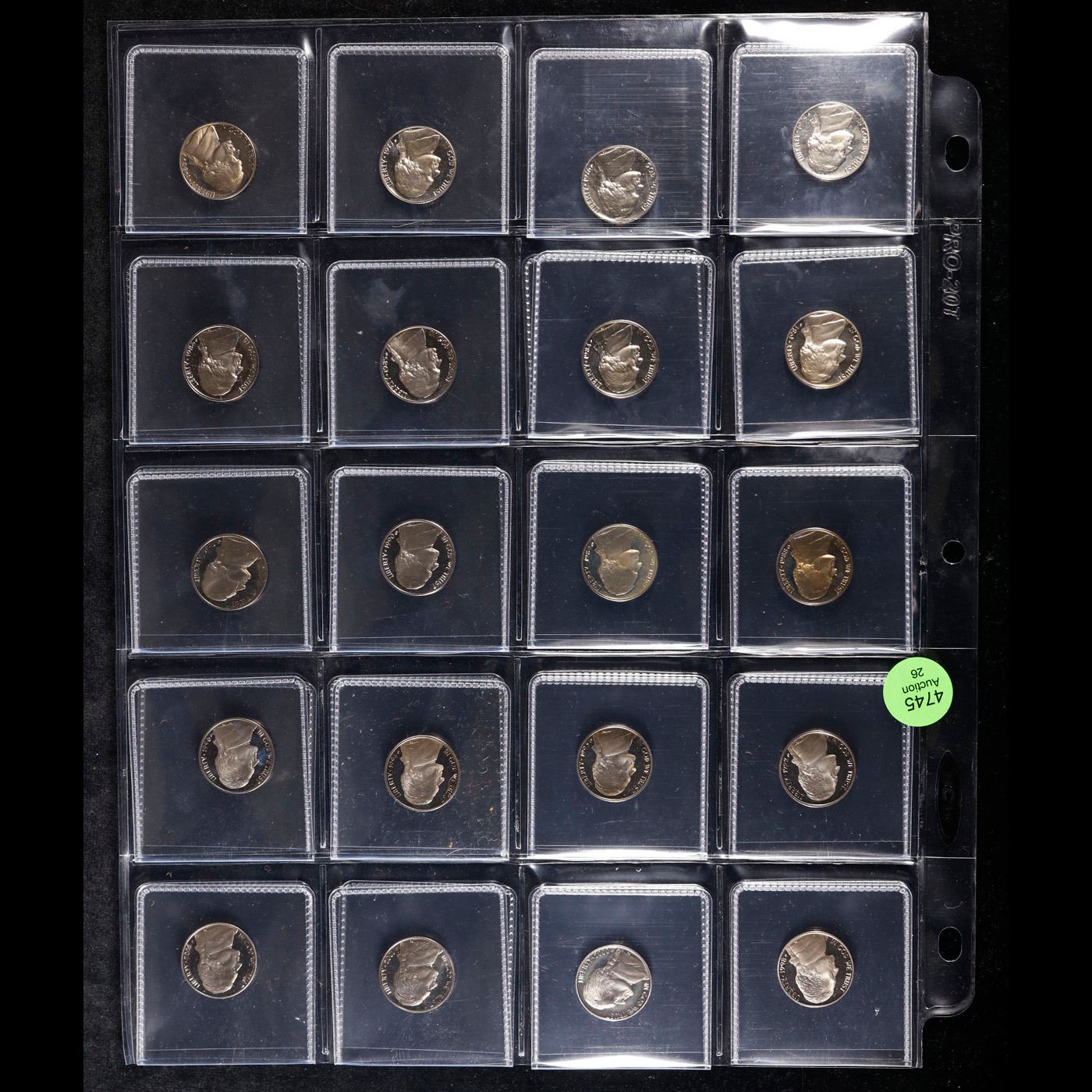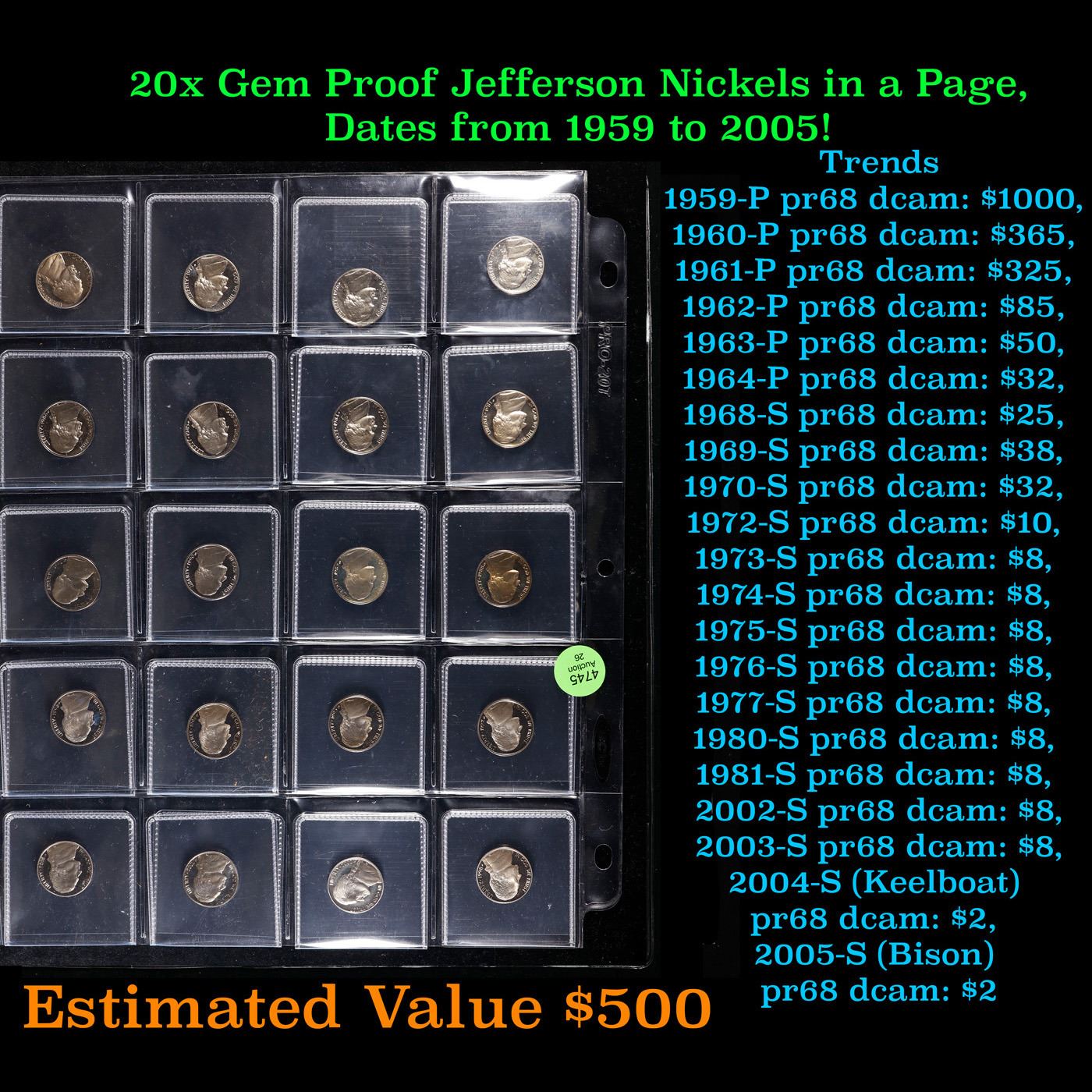 Huge Liifetime Collection - Too Many Coins To Auction Individually - This Lot is For One Page of 20 Proof Jefferson Nickels Dates Range From 1971-2006. We have received a huge collection of over 10 thousand US coins in flips, 2x2 holders, and 20 coin pages. We are forced, due to limited lots, to sell this collection in pages of 20 coins. This Page is For 20 Proof Jefferson Nickels. Trends 1987-s pr69 DCAM $15, 1980-s pr69 DCAM $10, 2006-s pr69 DCAM $15, 1985-s pr69 DCAM $15, 1972-s pr69 DCAM $36, 2002-s pr69 DCAM $15, 1971-s pr69 DCAM $200, 2006-s pr69 DCAM $15, 1981-s pr69 DCAM $20, 1983-s pr69 DCAM $15, 1992-s pr69 DCAM $15, 1992-s pr69 DCAM $15, 1980-s pr69 DCAM $10, 1980-s pr69 DCAM $10, 2001-s pr69 DCAM $15, 1981-s pr69 DCAM $20, 1993-s pr69 DCAM $15, 1985-s pr69 DCAM $15, 1991-s pr69 DCAM $15, 1980-s pr69 DCAM $10. We estimate the value of each page to meet or exceed $200 in value! Good luck and happy hunting.