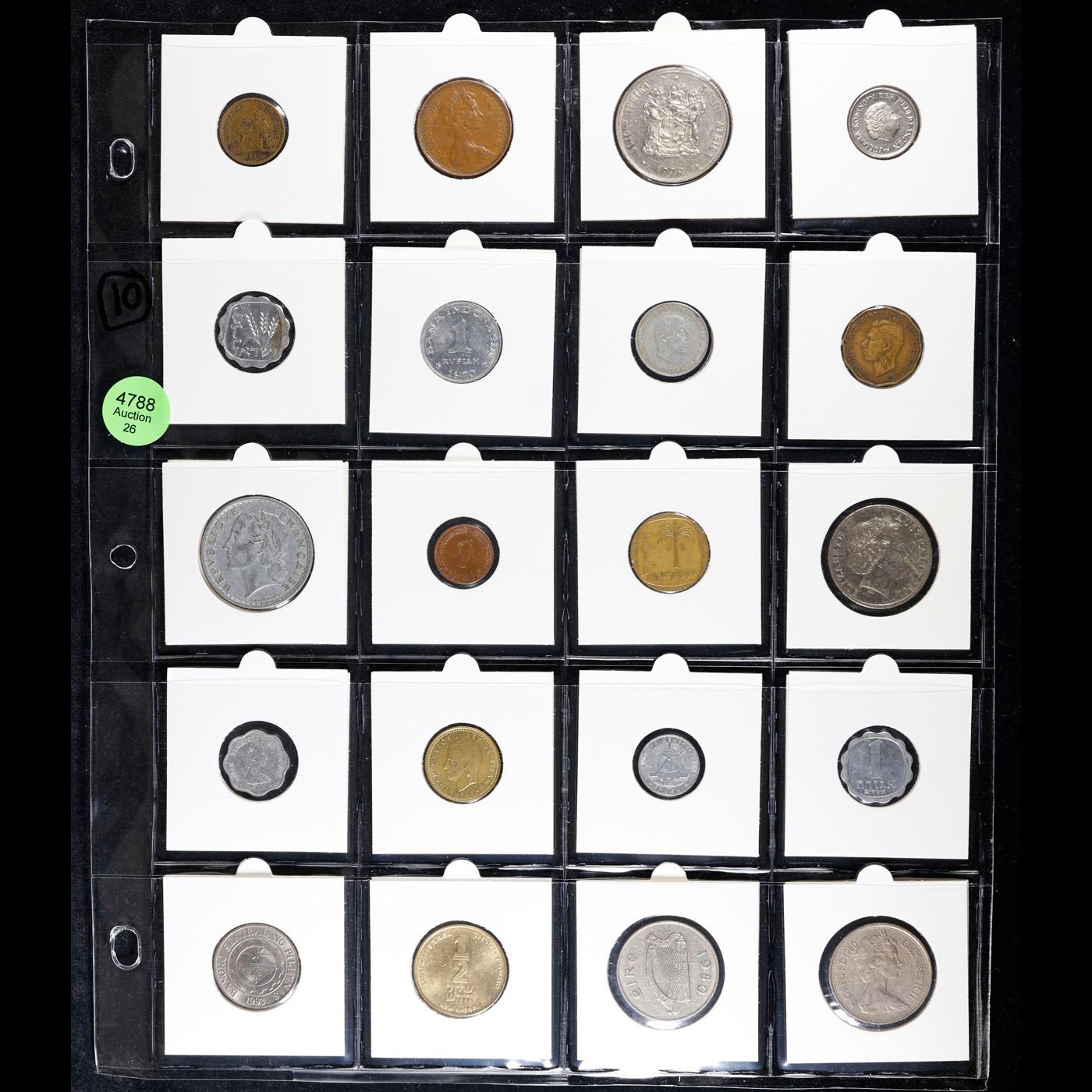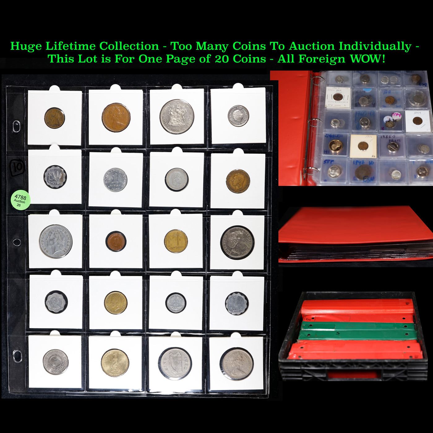 Huge Liifetime Collection - Too Many Coins To Auction Individually - This Lot is For One Page of 20 Foreign Coins. We have received a huge collection of over 10 thousand US coins in flips, 2x2 holders, and 20 coin pages. We are forced, due to limited lots, to sell this collection in pages of 20 coins. All of the pages include Silver Coins. Most contain Indian Cents, Proof Coins, Barber Coinage, Bust Coinage, Lincoln Cents, Flying Eagles, Jefferson Nickels, Roosevelt Dimes, Buffalo Nickels, Eisenhower Dollars, Kennedy Halves, Large Cents including some Draped Bust Large Cents, Mercury Dimes, and Liberty V Nickels. These pages could not be reviewed by anyone in our office due to time constraints. We estimate the value of each page to meet or exceed $200 in value! Good luck and happy hunting.