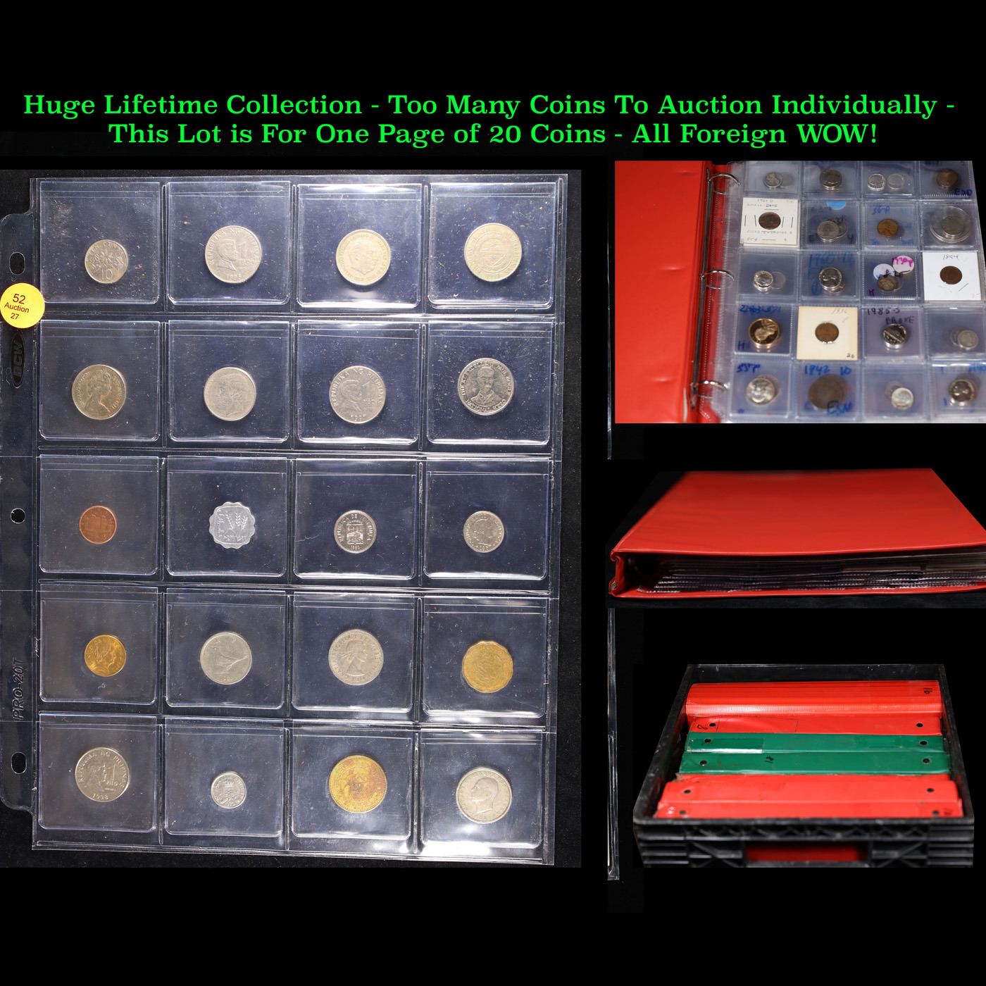 Huge Liifetime Collection - Too Many Coins To Auction Individually - This Lot is For One Page of 20 Foreign Coins. We have received a huge collection of over 10 thousand US coins in flips, 2x2 holders, and 20 coin pages. We are forced, due to limited lots, to sell this collection in pages of 20 coins. All of the pages include Silver Coins. Most contain Indian Cents, Proof Coins, Barber Coinage, Bust Coinage, Lincoln Cents, Flying Eagles, Jefferson Nickels, Roosevelt Dimes, Buffalo Nickels, Eisenhower Dollars, Kennedy Halves, Large Cents including some Draped Bust Large Cents, Mercury Dimes, and Liberty V Nickels. These pages could not be reviewed by anyone in our office due to time constraints. We estimate the value of each page to meet or exceed $200 in value! Good luck and happy hunting.