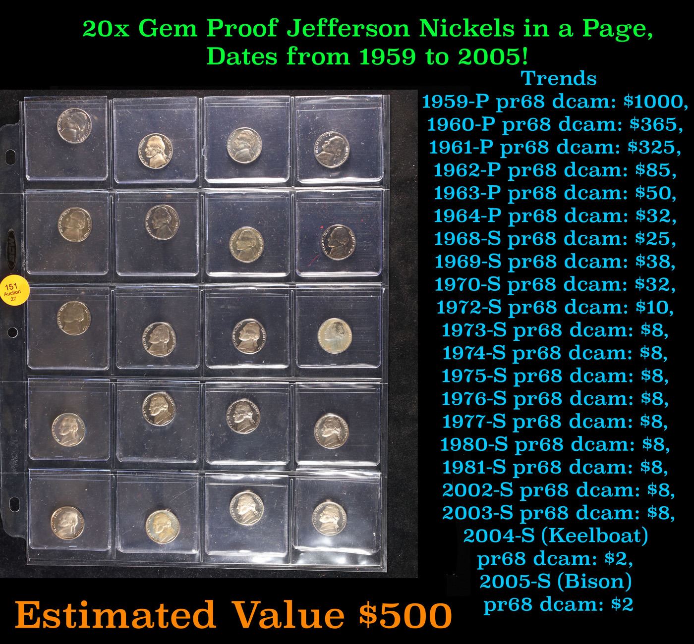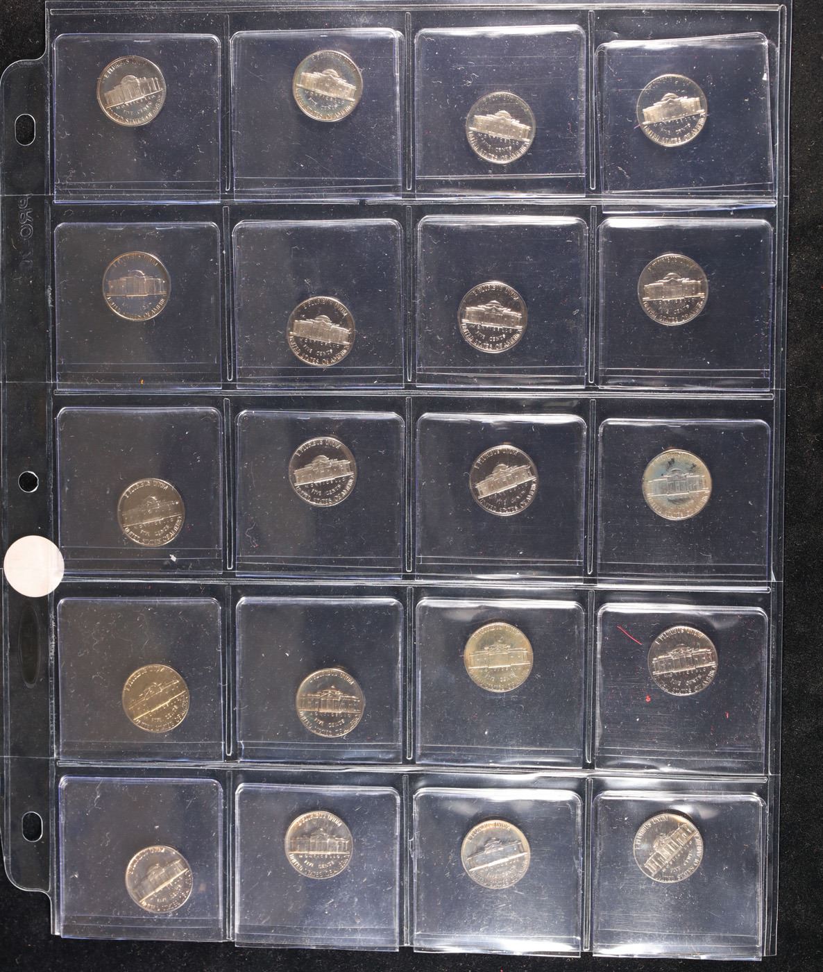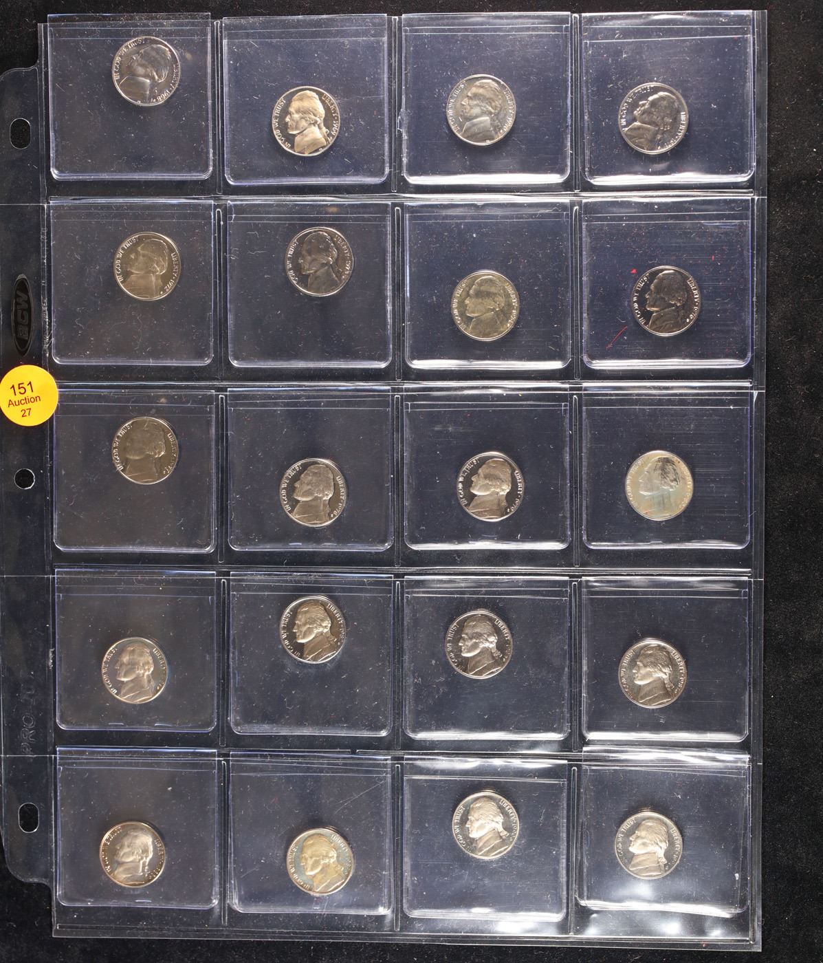 Huge Liifetime Collection - Too Many Coins To Auction Individually - This Lot is For One Page of 20 Proof Jefferson Nickels Dates Range From 1971-2006. We have received a huge collection of over 10 thousand US coins in flips, 2x2 holders, and 20 coin pages. We are forced, due to limited lots, to sell this collection in pages of 20 coins. This Page is For 20 Proof Jefferson Nickels. Trends 1987-s pr69 DCAM $15, 1980-s pr69 DCAM $10, 2006-s pr69 DCAM $15, 1985-s pr69 DCAM $15, 1972-s pr69 DCAM $36, 2002-s pr69 DCAM $15, 1971-s pr69 DCAM $200, 2006-s pr69 DCAM $15, 1981-s pr69 DCAM $20, 1983-s pr69 DCAM $15, 1992-s pr69 DCAM $15, 1992-s pr69 DCAM $15, 1980-s pr69 DCAM $10, 1980-s pr69 DCAM $10, 2001-s pr69 DCAM $15, 1981-s pr69 DCAM $20, 1993-s pr69 DCAM $15, 1985-s pr69 DCAM $15, 1991-s pr69 DCAM $15, 1980-s pr69 DCAM $10. We estimate the value of each page to meet or exceed $200 in value! Good luck and happy hunting.