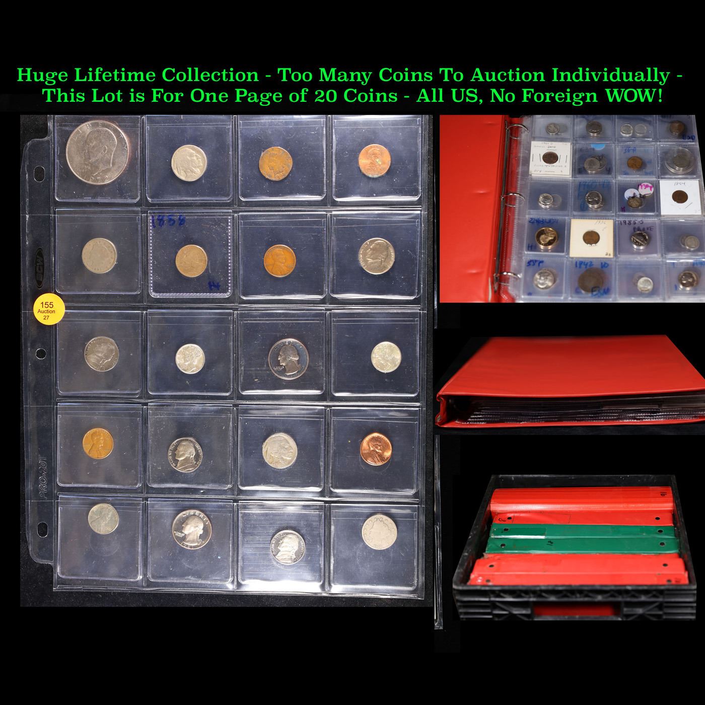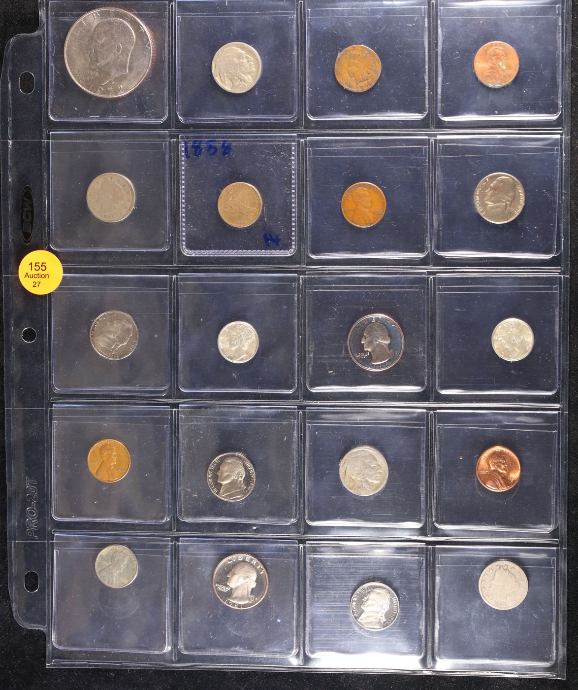 Huge Liifetime Collection - Too Many Coins To Auction Individually - This Lot is For One Page of 20 Coins - All US, No Foreign WOW!. We have received a huge collection of over 10 thousand US coins in flips, 2x2 holders, and 20 coin pages. We are forced, due to limited lots, to sell this collection in pages of 20 coins. All of the pages include Silver Coins. Most contain Indian Cents, Proof Coins, Barber Coinage, Bust Coinage, Lincoln Cents, Flying Eagles, Jefferson Nickels, Roosevelt Dimes, Buffalo Nickels, Eisenhower Dollars, Kennedy Halves, Large Cents including some Draped Bust Large Cents, Mercury Dimes, and Liberty V Nickels. These pages could not be reviewed by anyone in our office due to time constraints. We estimate the value of each page to meet or exceed $200 in value! Good luck and happy hunting.