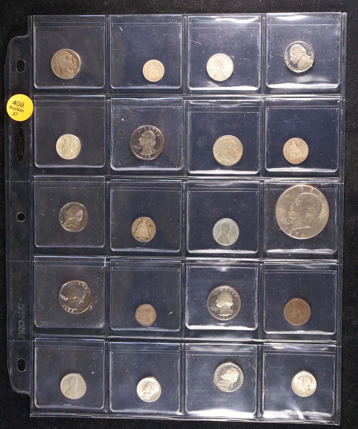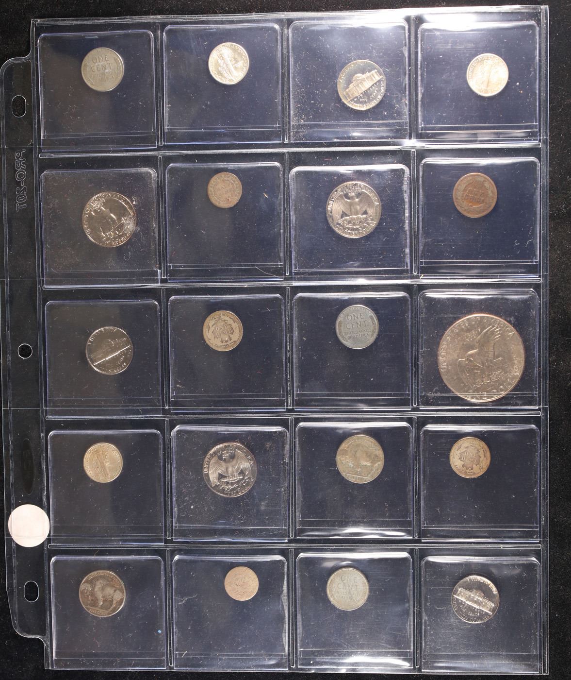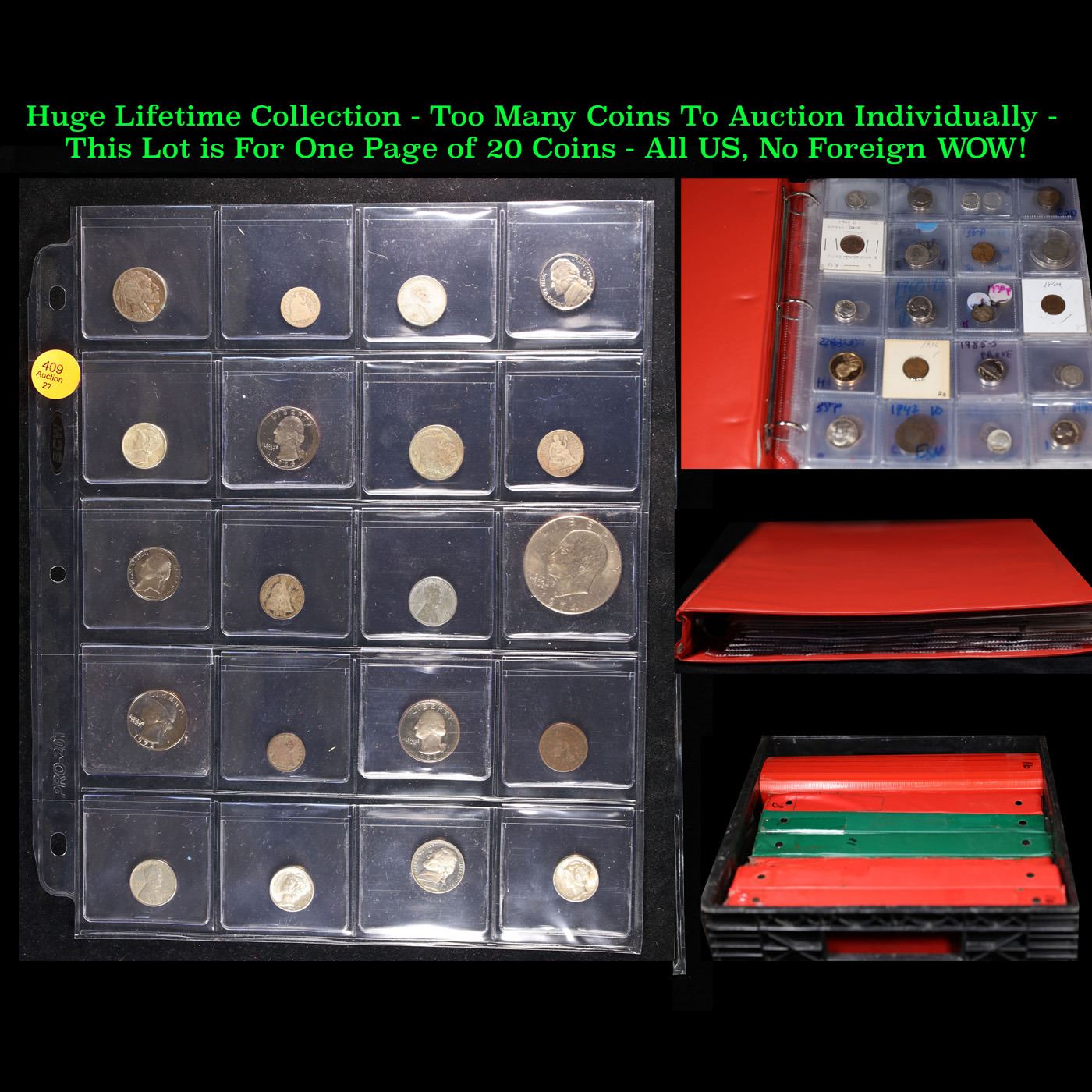 Huge Liifetime Collection - Too Many Coins To Auction Individually - This Lot is For One Page of 20 Coins - All US, No Foreign WOW!. We have received a huge collection of over 10 thousand US coins in flips, 2x2 holders, and 20 coin pages. We are forced, due to limited lots, to sell this collection in pages of 20 coins. All of the pages include Silver Coins. Most contain Indian Cents, Proof Coins, Barber Coinage, Bust Coinage, Lincoln Cents, Flying Eagles, Jefferson Nickels, Roosevelt Dimes, Buffalo Nickels, Eisenhower Dollars, Kennedy Halves, Large Cents including some Draped Bust Large Cents, Mercury Dimes, and Liberty V Nickels. These pages could not be reviewed by anyone in our office due to time constraints. We estimate the value of each page to meet or exceed $200 in value! Good luck and happy hunting.