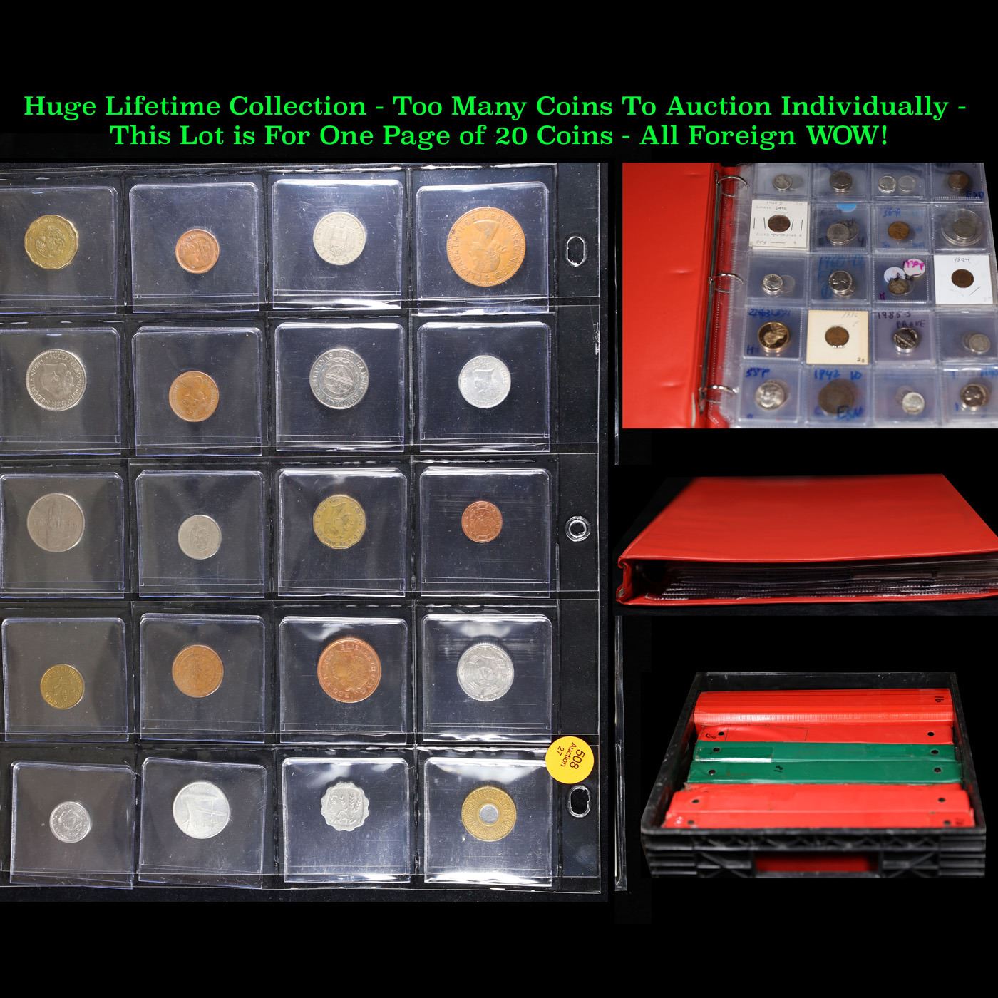 Huge Liifetime Collection - Too Many Coins To Auction Individually - This Lot is For One Page of 20 Foreign Coins. We have received a huge collection of over 10 thousand US coins in flips, 2x2 holders, and 20 coin pages. We are forced, due to limited lots, to sell this collection in pages of 20 coins. All of the pages include Silver Coins. Most contain Indian Cents, Proof Coins, Barber Coinage, Bust Coinage, Lincoln Cents, Flying Eagles, Jefferson Nickels, Roosevelt Dimes, Buffalo Nickels, Eisenhower Dollars, Kennedy Halves, Large Cents including some Draped Bust Large Cents, Mercury Dimes, and Liberty V Nickels. These pages could not be reviewed by anyone in our office due to time constraints. We estimate the value of each page to meet or exceed $200 in value! Good luck and happy hunting.