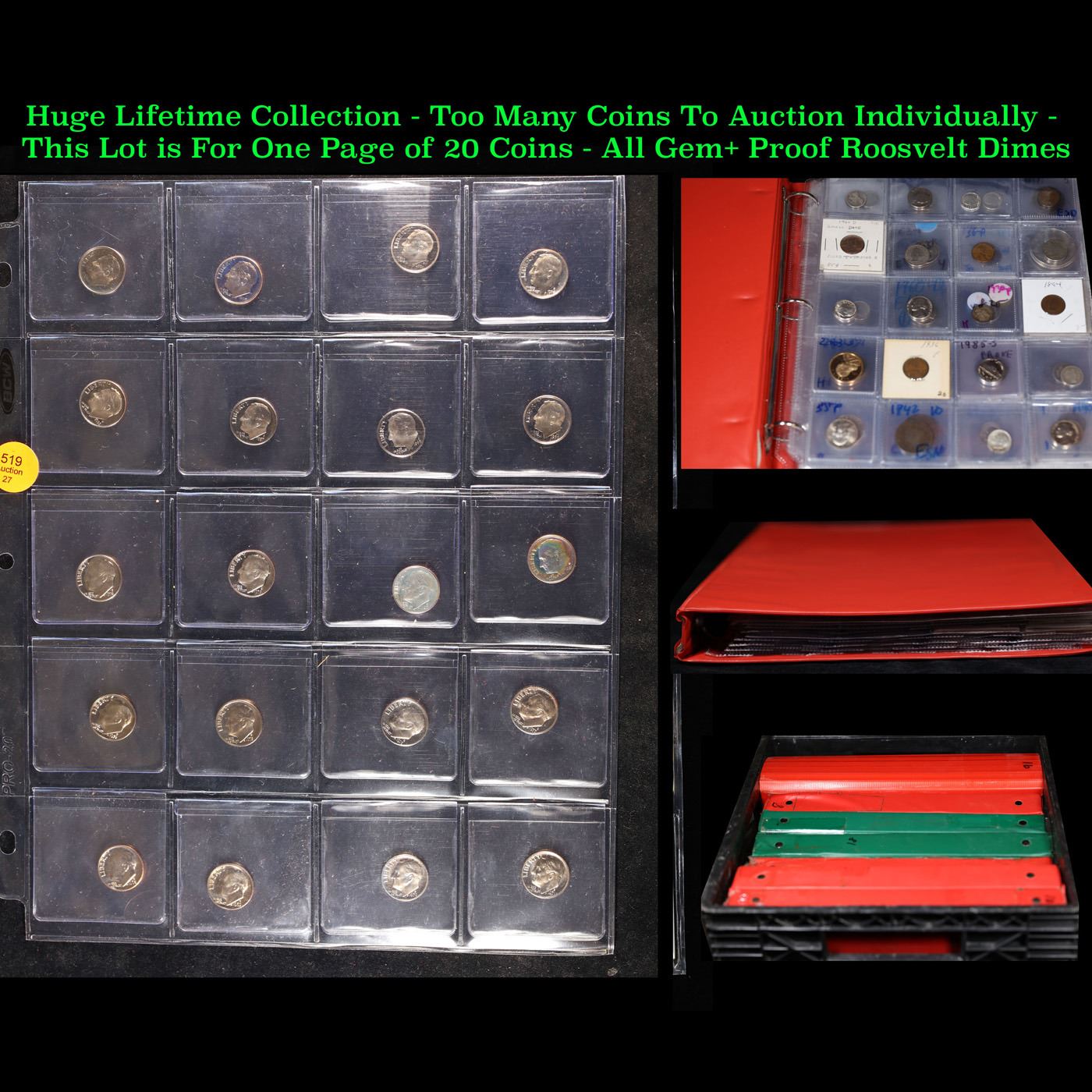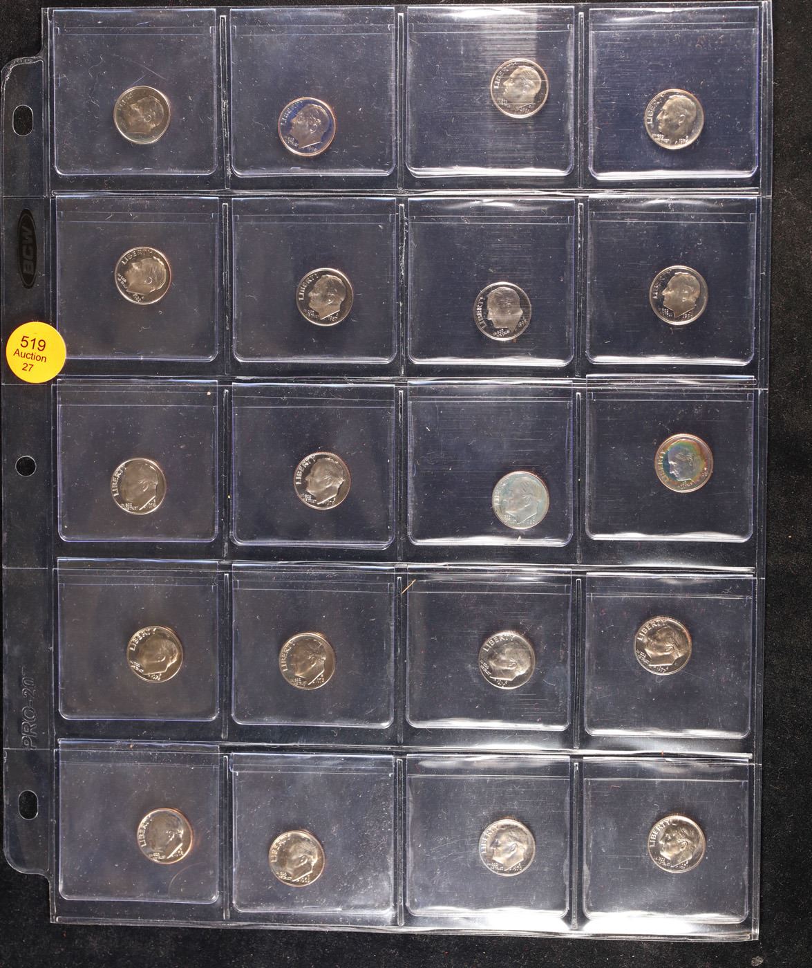 Huge Liifetime Collection - Too Many Coins To Auction Individually - This Lot is For One Page of 20 Proof Roosevelt Dimes Dates Range From 1970-2006. We have received a huge collection of over 10 thousand US coins in flips, 2x2 holders, and 20 coin pages. We are forced, due to limited lots, to sell this collection in pages of 20 coins. This Page is For 20 Proof Roosevelt Dimes. Trends 1981-s pr69 DCAM $38, 1980-s pr69 DCAM $16, 1972-s pr69 DCAM $24, 1971-s pr69 DCAM $115, 1987-s pr69 DCAM $16, 1984-s pr69 DCAM $16, 1983-s pr69 DCAM $16, 1982-s pr69 DCAM $16, 1992-s pr69 DCAM $16, 2000-s pr69 DCAM $16, 1990-s pr69 DCAM $16, 1988-s pr69 DCAM $16, 2006-s pr69 DCAM $16, 2003-s pr69 DCAM $16, 1976-s pr69 DCAM $15, 2002-s pr69 DCAM $16, 1997-s pr69 DCAM $16, 1998-s pr69 DCAM $16, 1970-s pr69 DCAM $75, 1996-s pr69 DCAM $16. We estimate the value of each page to meet or exceed $200 in value! Good luck and happy hunting.