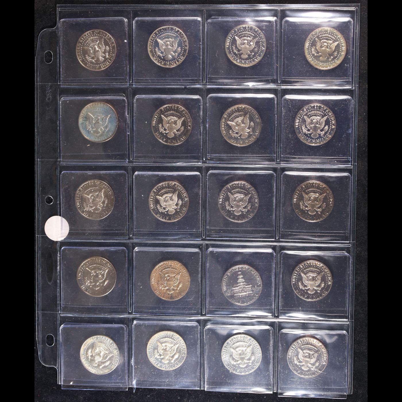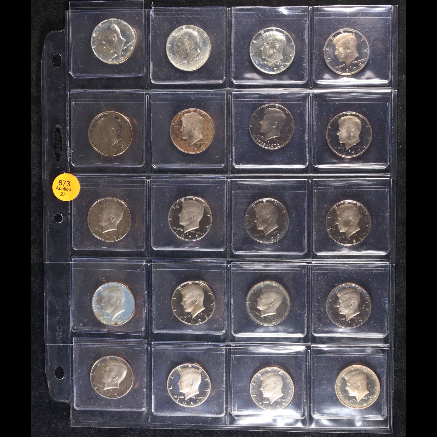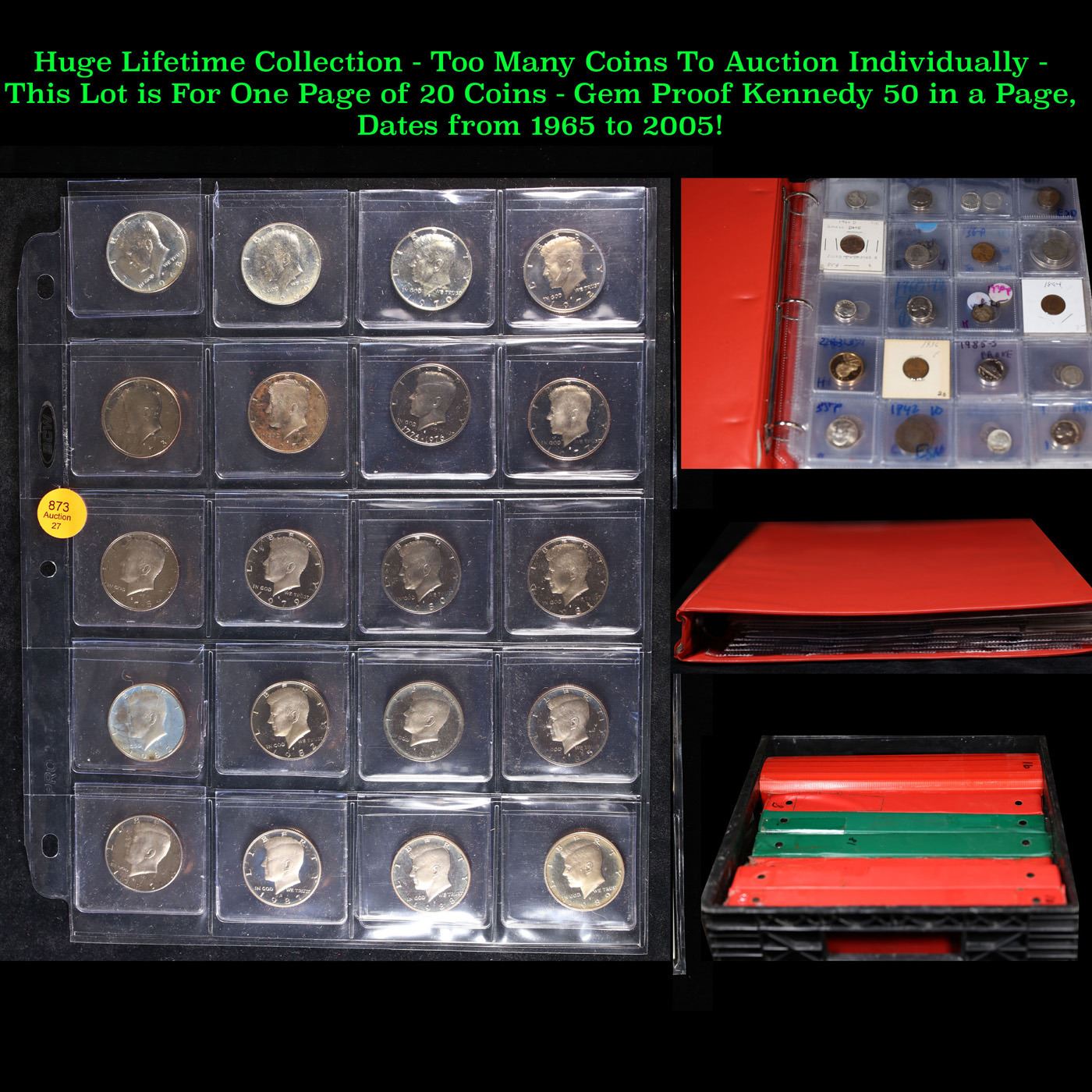 Huge Liifetime Collection - Too Many Coins To Auction Individually - This Lot is For One Page of 20 Proof Kennedy Half Dollars Dates Range From 1968-2006. We have received a huge collection of over 10 thousand US coins in flips, 2x2 holders, and 20 coin pages. We are forced, due to limited lots, to sell this collection in pages of 20 coins. This Page is For 20 Proof Kennedy Half Dollars. Trends 1983-s pr69 DCAM $16, 1981-s pr69 DCAM $50, 1980-s pr69 DCAM $16, 1972-s pr69 DCAM $60, 1970-s pr69 DCAM $350, 1990-s pr69 DCAM $16, 1989-s pr69 DCAM $14, 1987-s pr69 DCAM $16, 1998-s pr69 DCAM $16, 1974-s pr69 DCAM $17, 1973-s pr69 DCAM $20, 1968-s pr69 DCAM $250, 2006-s pr69 DCAM $12, 2003-s pr69 DCAM $16, 2002-s pr69 DCAM $16, 2000-s pr69 DCAM $12, 1996-s pr69 DCAM $14, 1985-s pr69 DCAM $16, 1986-s pr69 DCAM $16, 1999-s pr69 DCAM $16. We estimate the value of each page to meet or exceed $200 in value! Good luck and happy hunting.