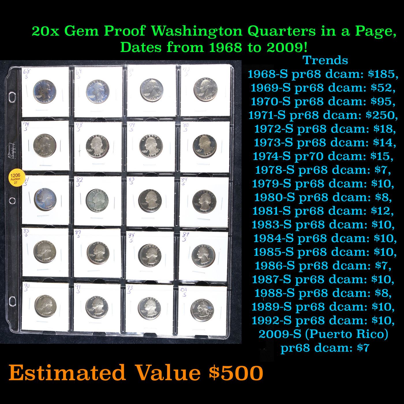 Huge Liifetime Collection - Too Many Coins To Auction Individually - This Lot is For One Page of 20 Proof Washington Quarters Dates Range From 1982-2006. We have received a huge collection of over 10 thousand US coins in flips, 2x2 holders, and 20 coin pages. We are forced, due to limited lots, to sell this collection in pages of 20 coins. This Page is For 20 Proof Washington Quarters Trends 2002-s pr69 DCAM $19 1994-s pr69 DCAM $16, 1982-s pr69 DCAM $15, 2002-s pr69 DCAM $19, 2006-s pr69 DCAM $19, 2003-s pr69 DCAM $19, 2003-s pr69 DCAM $19, 2002-s pr69 DCAM $19, 1993-s pr69 DCAM $16, 1982-s pr69 DCAM $15, 1991-s pr69 DCAM $16, 1982-s pr69 DCAM $15, 1990-s pr69 DCAM $16, 1983-s pr69 DCAM $16, 1985-s pr69 DCAM $16, 1987-s pr69 DCAM $16, 1996-s pr69 DCAM $16, 1993-s pr69 DCAM $16, 1983-s pr69 DCAM $16, 1984-s pr69 DCAM $16. We estimate the value of each page to meet or exceed $200 in value! Good luck and happy hunting.