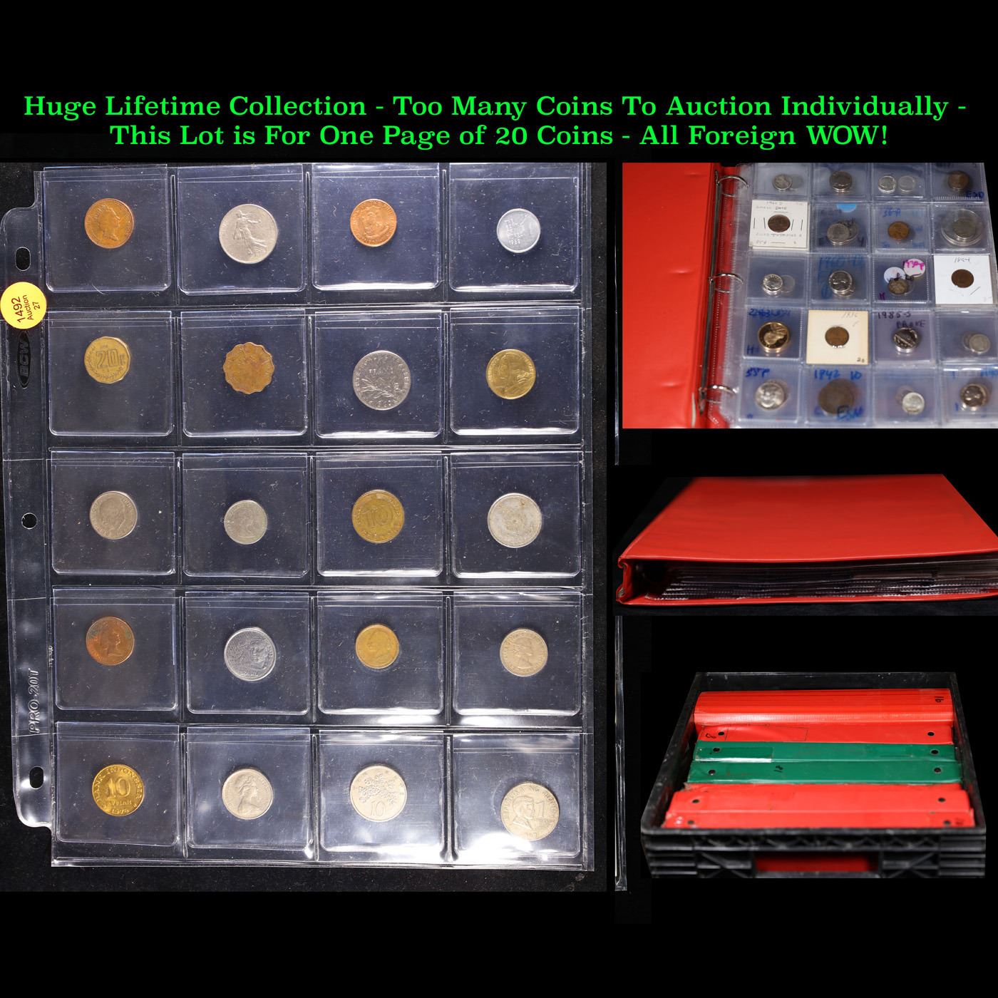 Huge Liifetime Collection - Too Many Coins To Auction Individually - This Lot is For One Page of 20 Foreign Coins. We have received a huge collection of over 10 thousand US coins in flips, 2x2 holders, and 20 coin pages. We are forced, due to limited lots, to sell this collection in pages of 20 coins. All of the pages include Silver Coins. Most contain Indian Cents, Proof Coins, Barber Coinage, Bust Coinage, Lincoln Cents, Flying Eagles, Jefferson Nickels, Roosevelt Dimes, Buffalo Nickels, Eisenhower Dollars, Kennedy Halves, Large Cents including some Draped Bust Large Cents, Mercury Dimes, and Liberty V Nickels. These pages could not be reviewed by anyone in our office due to time constraints. We estimate the value of each page to meet or exceed $200 in value! Good luck and happy hunting.