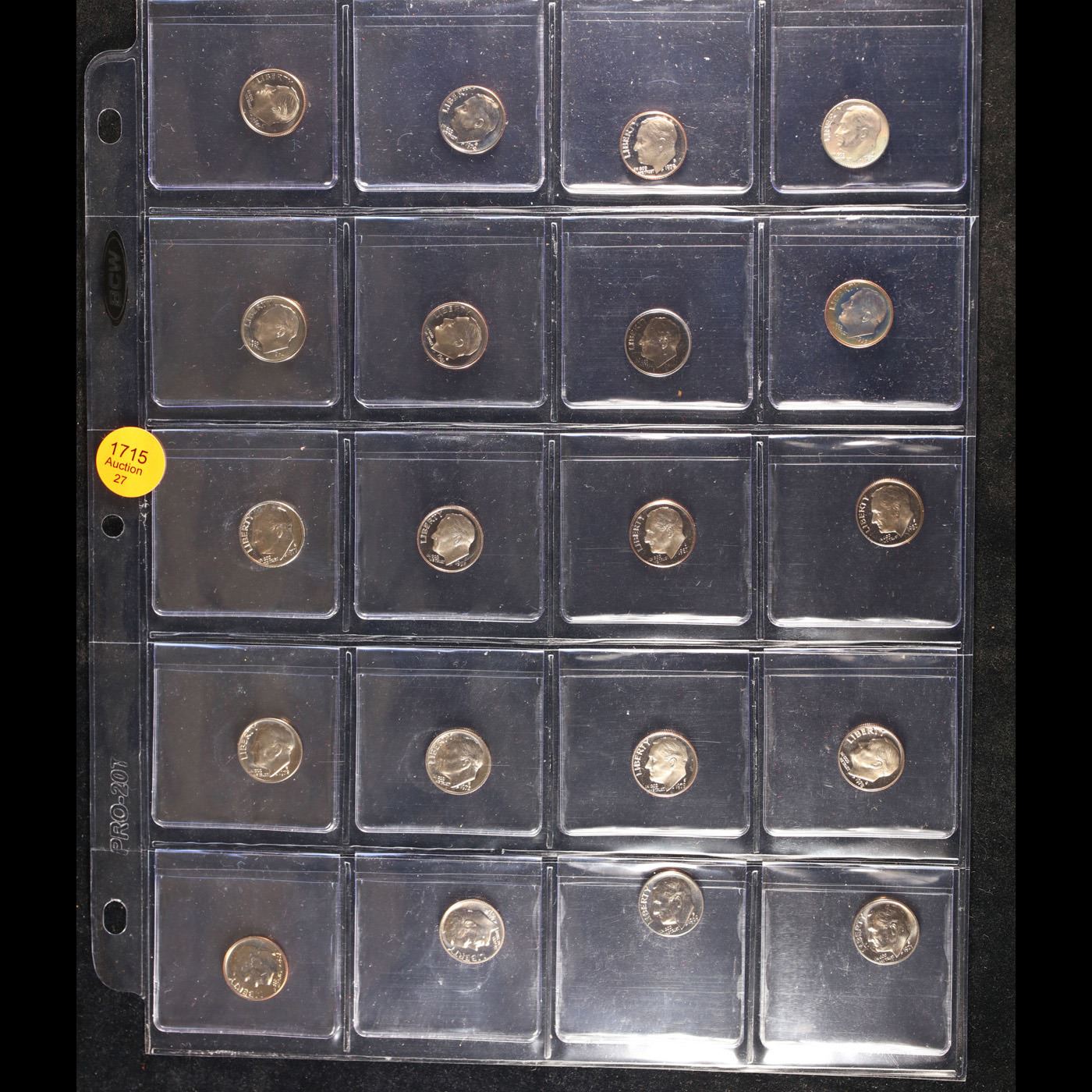 Huge Liifetime Collection - Too Many Coins To Auction Individually - This Lot is For One Page of 20 Proof Roosevelt Dimes Dates Range From 1970-2006. We have received a huge collection of over 10 thousand US coins in flips, 2x2 holders, and 20 coin pages. We are forced, due to limited lots, to sell this collection in pages of 20 coins. This Page is For 20 Proof Roosevelt Dimes. Trends 1981-s pr69 DCAM $38, 1980-s pr69 DCAM $16, 1972-s pr69 DCAM $24, 1971-s pr69 DCAM $115, 1987-s pr69 DCAM $16, 1984-s pr69 DCAM $16, 1983-s pr69 DCAM $16, 1982-s pr69 DCAM $16, 1992-s pr69 DCAM $16, 2000-s pr69 DCAM $16, 1990-s pr69 DCAM $16, 1988-s pr69 DCAM $16, 2006-s pr69 DCAM $16, 2003-s pr69 DCAM $16, 1976-s pr69 DCAM $15, 2002-s pr69 DCAM $16, 1997-s pr69 DCAM $16, 1998-s pr69 DCAM $16, 1970-s pr69 DCAM $75, 1996-s pr69 DCAM $16. We estimate the value of each page to meet or exceed $200 in value! Good luck and happy hunting.